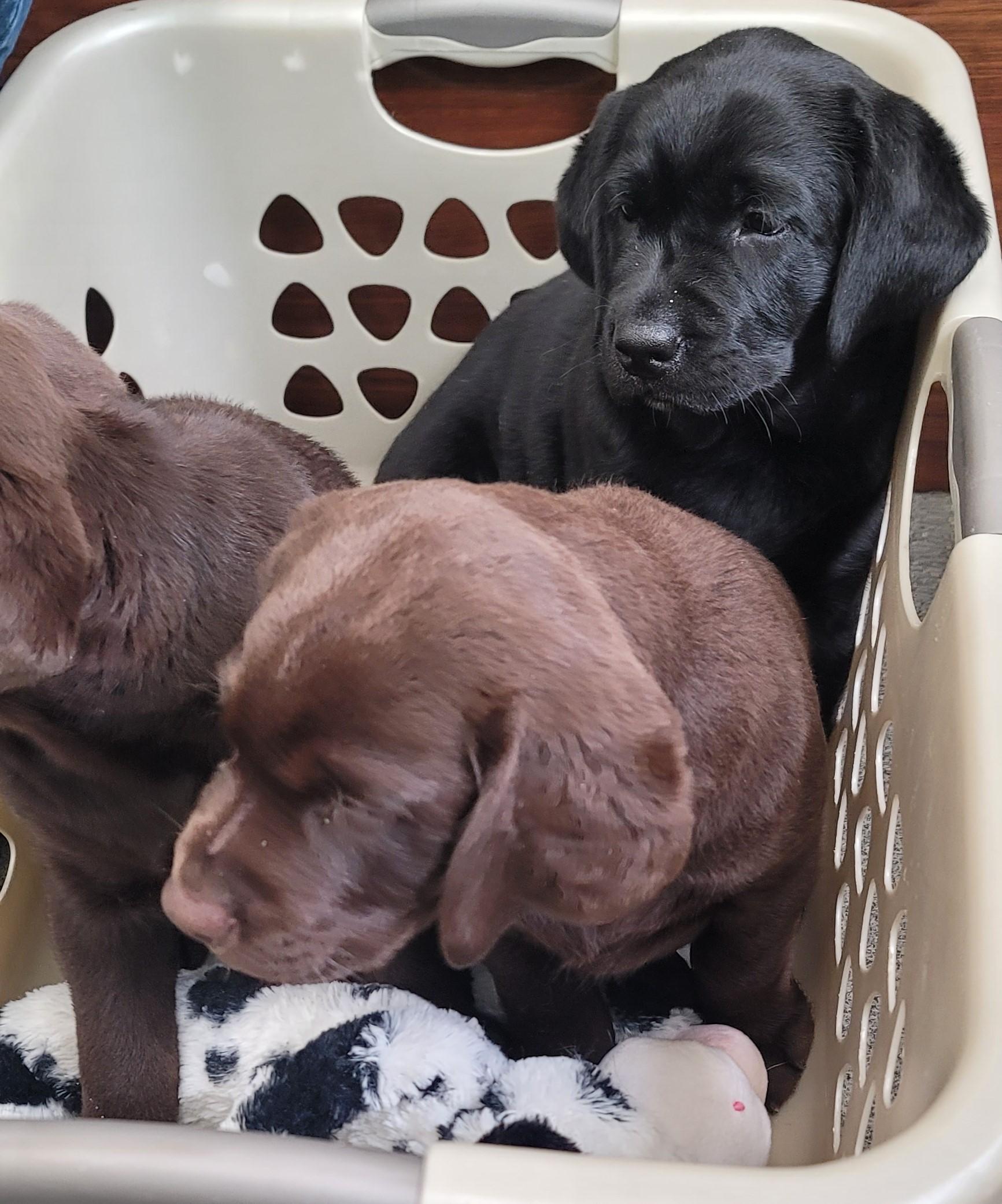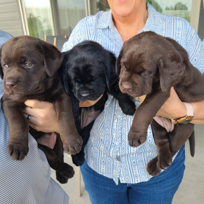 Our puppies include black, chocolate, and yellow. Colors will vary depending on the parent dogs.