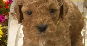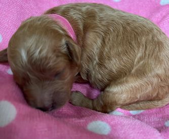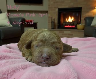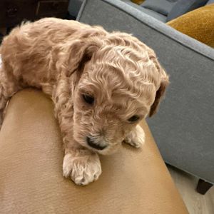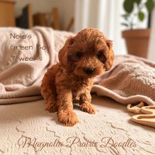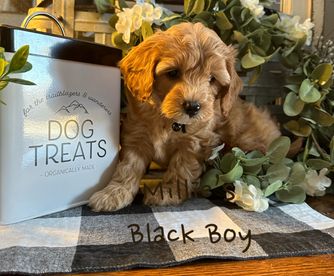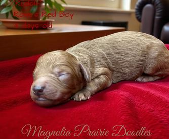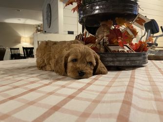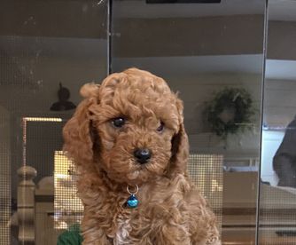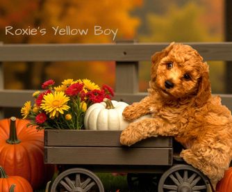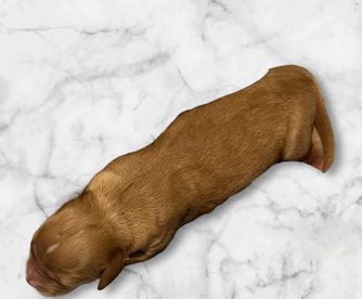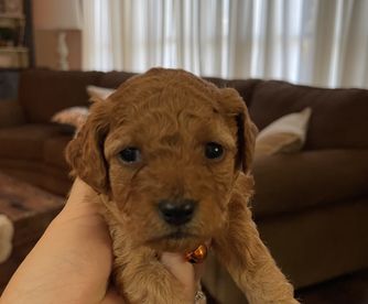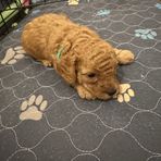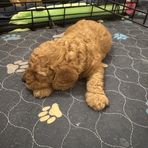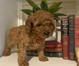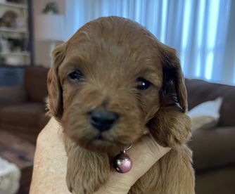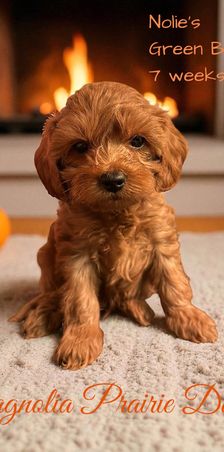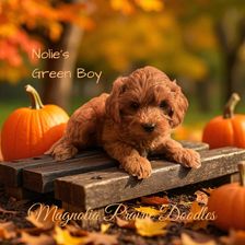 Nolie only has one puppy left in her litter. Green Boy is the smallest of the litter. Expected to be around 10 pounds. He is a little on the shy side… for about 5 minutes. Then he will be your shadow. He loves to be held and snuggled. He has a beautiful, red, soft wavy coat like his momma. Red Boy watches the others try new things. When he’s ready, he’s all in. His favorite toy is his little tennis ball. He chases it and growls at it and rolls around with. His favorite trick is waiting till the others are sleeping then launching himself off the top of the slide onto the puppy pile and waking everyone up !! He has alot of personality packed into his cute little puppy body!