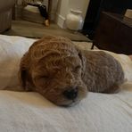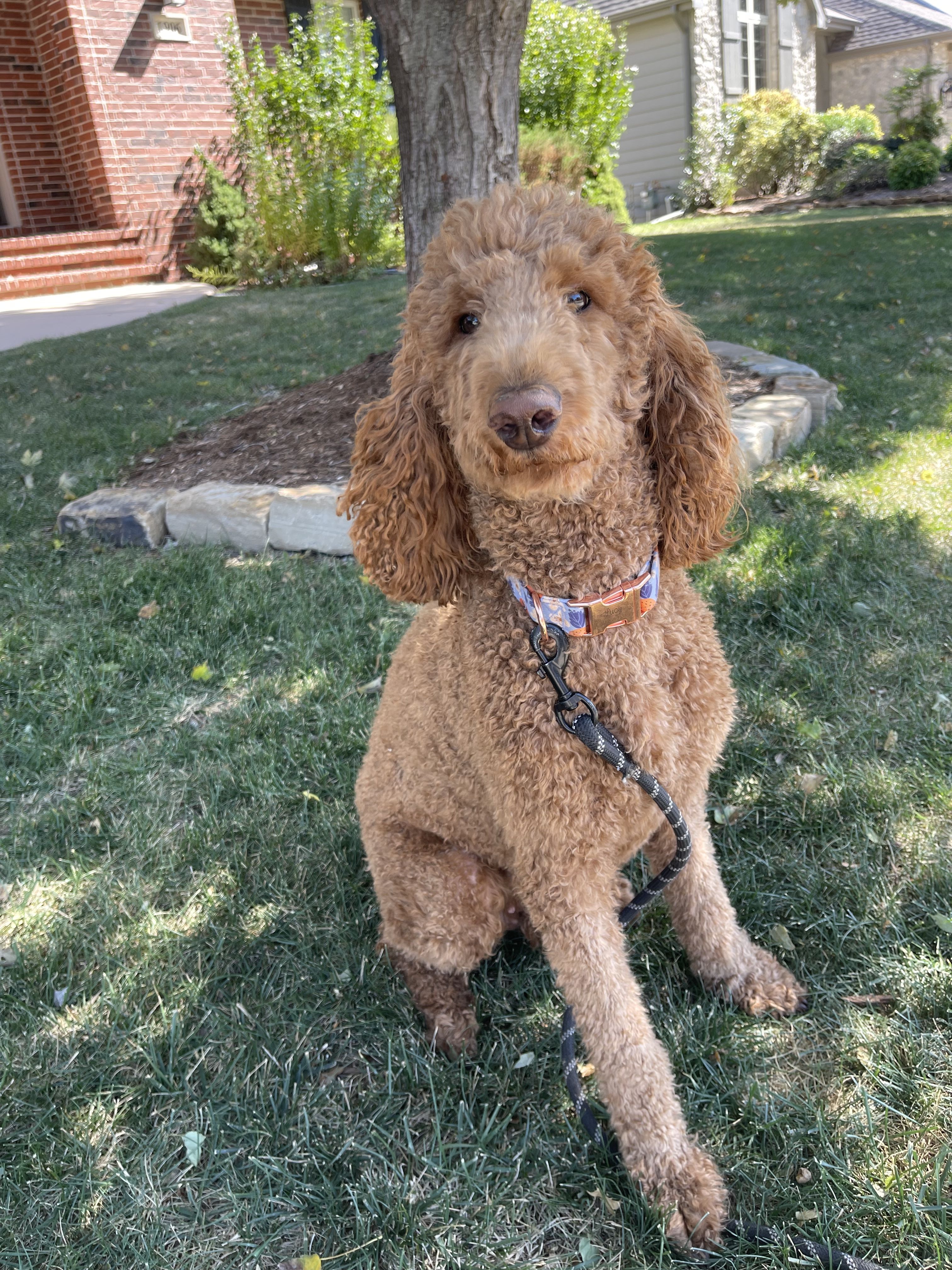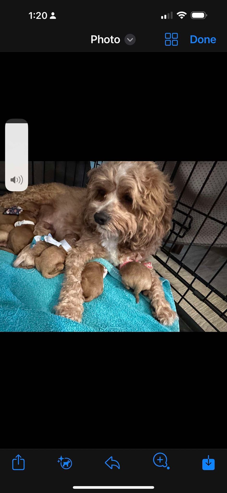 Beautiful red standard AKC registered poodle. Carries herself like royalty. Head and tale up, sits erect. We always get comments on what a beauty she is! Very loyal to her people. Walks off leash. Low prey drive. Has been a wonderful, attentive momma to her first litter but took a lot of encouragement at first. We have decided we want to stick with cavapoos and not breed bigger dogs so we turned ownership over to her guardian family, who were ecstatic!