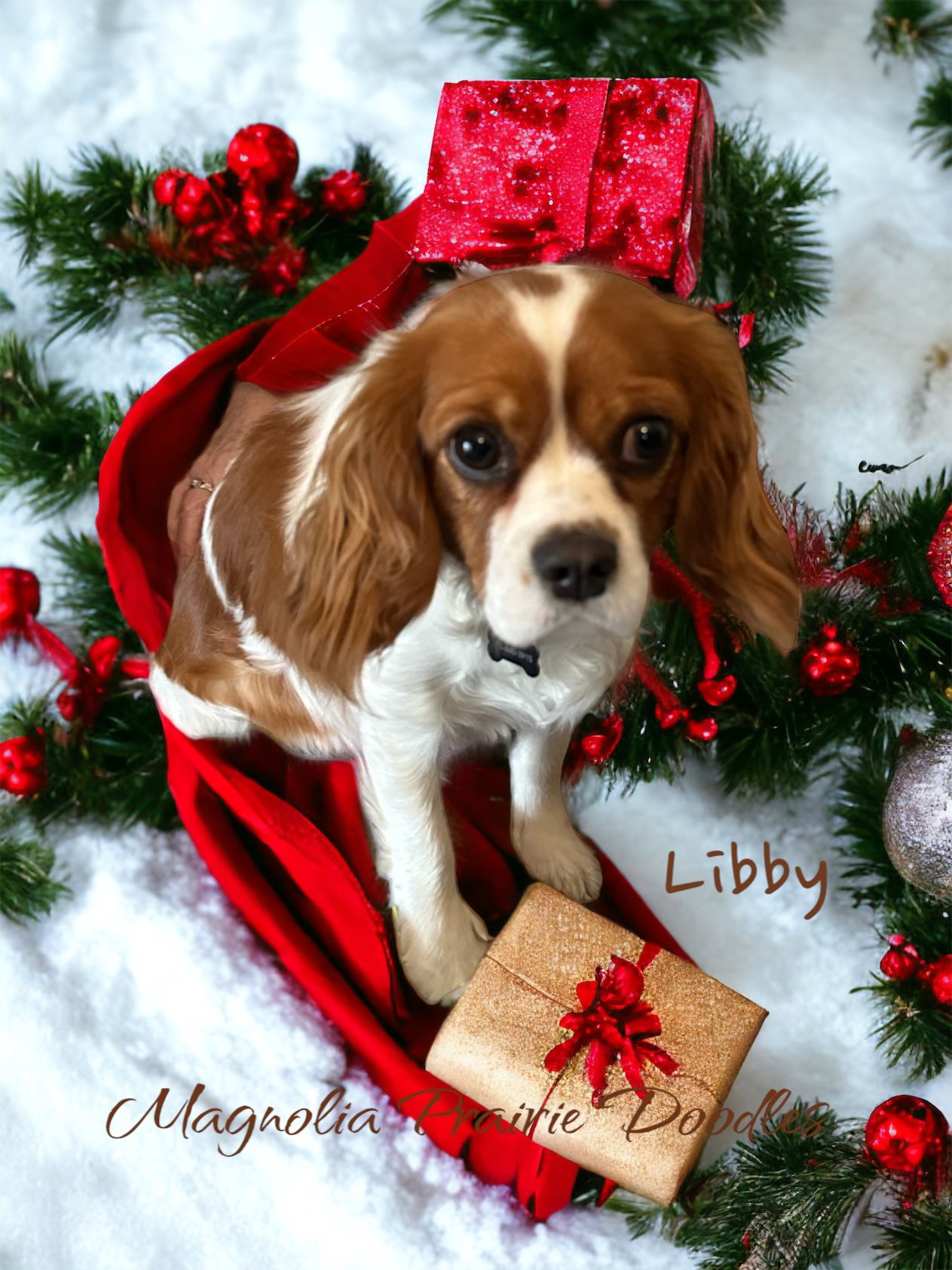 Libby is a beautiful pedigreed AKC King Charles Cavalier. She weighs about 20 lbs and is a diva for sure. Her favorite bonding activity is having her esrs combed. She loves it and would sit for hours being spoiled and pampered by her guardian, Karen. Libby also lives with Maggie who was a puppy we bred 9 years ago. Maggie is a chocolate lab and the two of them are best friends. Libby is an awesome momma and we can’t wait to see her babies!