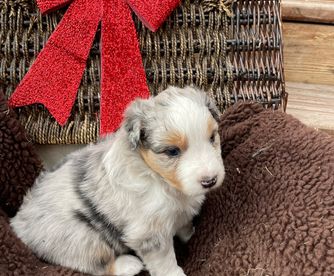 “Tris are $1000. Merles are $1,200. This litter will have natural long tails. Dew claws will be removed, and first round of deworming and vaccines will be done. . Deposit goes toward the full cost of puppy.”