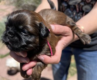 Grand rising! That beautiful creature is Ursula. Daughter of Yuri/Cleopatra. Cleopatra is Tasya’s daughter. Yuri is AKC and Tasya is CKC and dna confirmed she’s 100% pure bred Shih-Tzu. So Ursula does not have an AKC registration and one of the few without that doc. She was born 10.22.22, fluctuates 9-10 lbs and is spayed, microchipped, fully vaccinated, in perfect health, potty trained, responds to basic commands, just a sweetheart who loves attention and snuggles. Her coloring is brown gold dobbie. She is $3500.