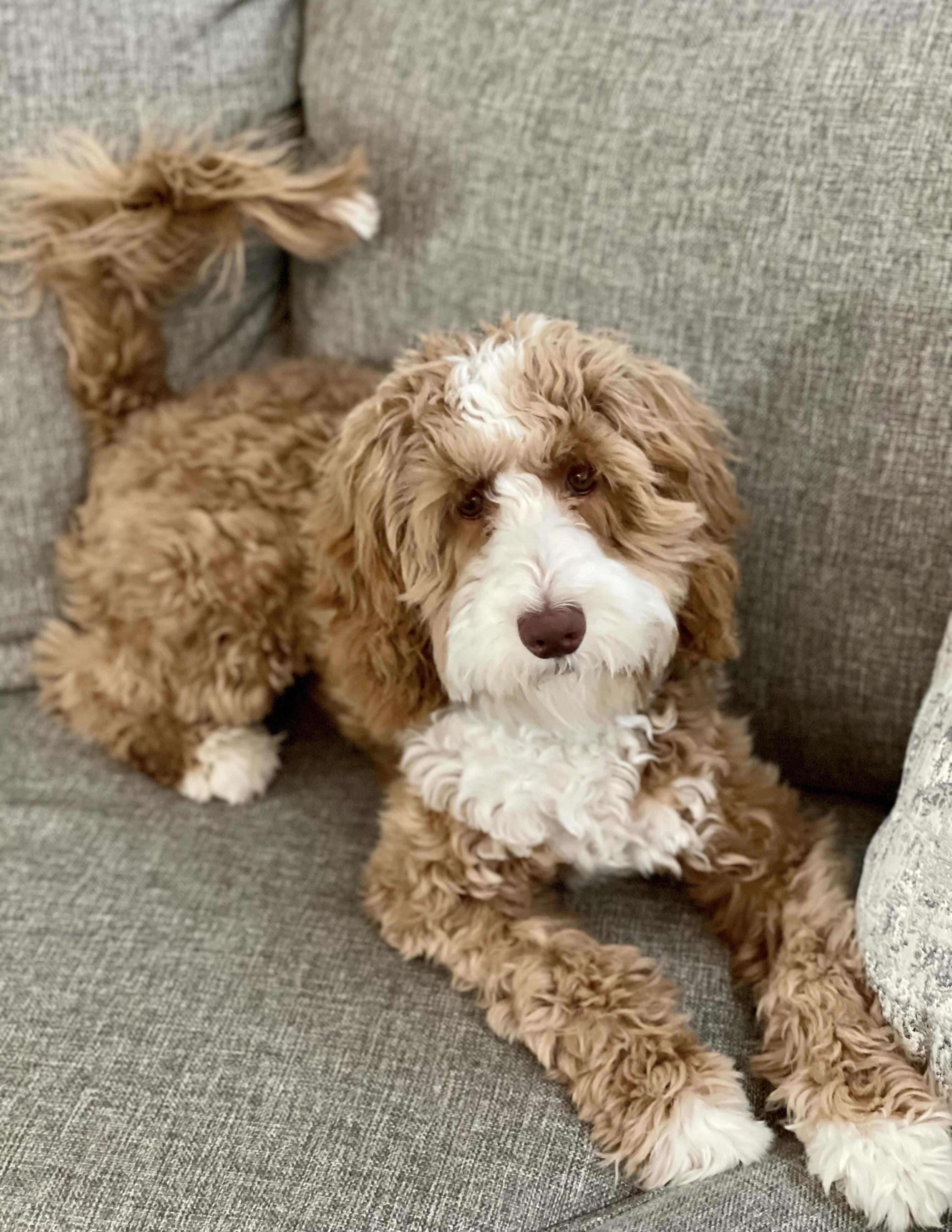 Kingston is a full tuxedo Mini Labradoodle with a wavy coat. His markings are wonderful. He lives with our Guardian family the Johnson's in Mt Airy NC. Kington is so sweet and loving especially with the kids.