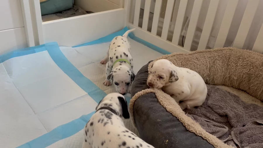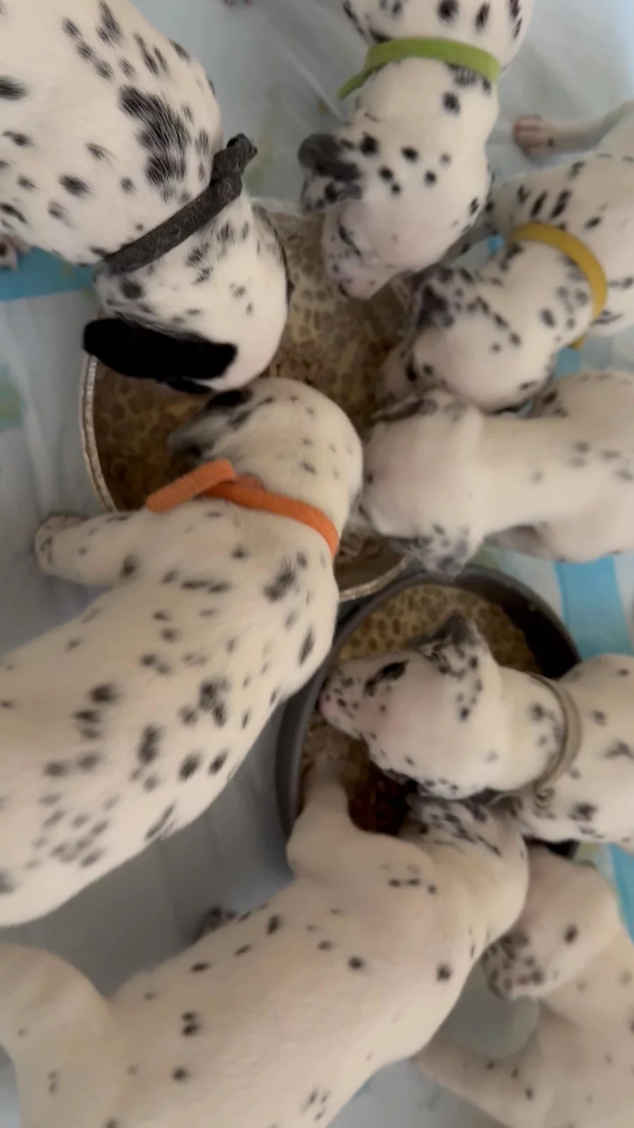 Mealtime is getting cuter (and messier)! Our little spotted crew is learning how to eat their soft puppy food and doing an amazing job — just look at that focus and teamwork!