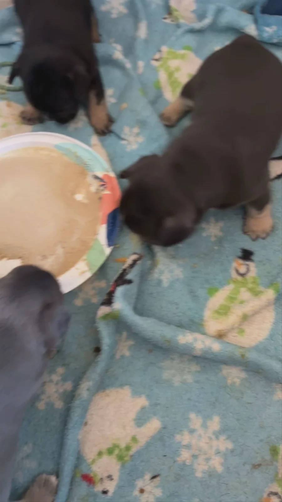 4 weeks old! These puppies are getting nice and chunky! I’ve also added a video of them eating their puppy mush! It’s a mixture of replacement milk and ground up puppy food. It helps them be able to eat more while still keeping milk in their diet. They do still nurse off mom also. They are working on keeping their balance for walking and playing. They are growing in their puppy teeth and have cute little barks and growls.