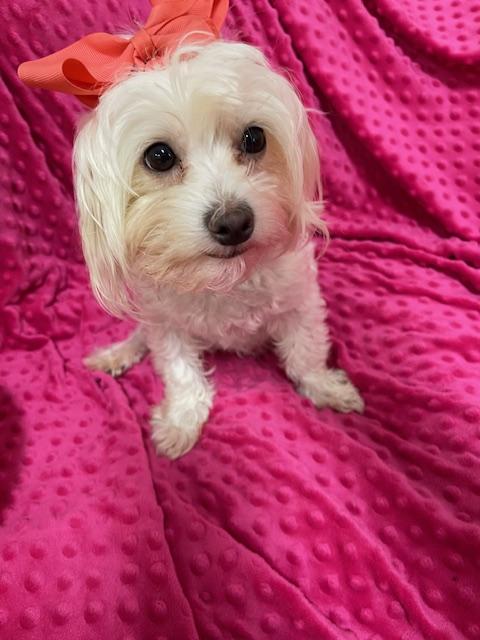 Maggie Mae is a sweet female Maltese. She weights 8 lbs.