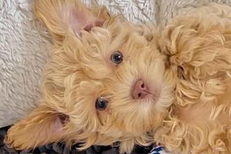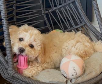 He’s you’re typical snuggly Maltipoo. He will sit between your legs while you’re watching tv & loves belly rubs & massages.