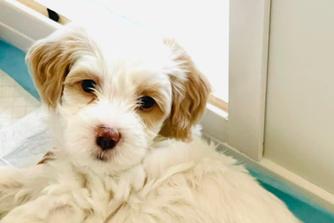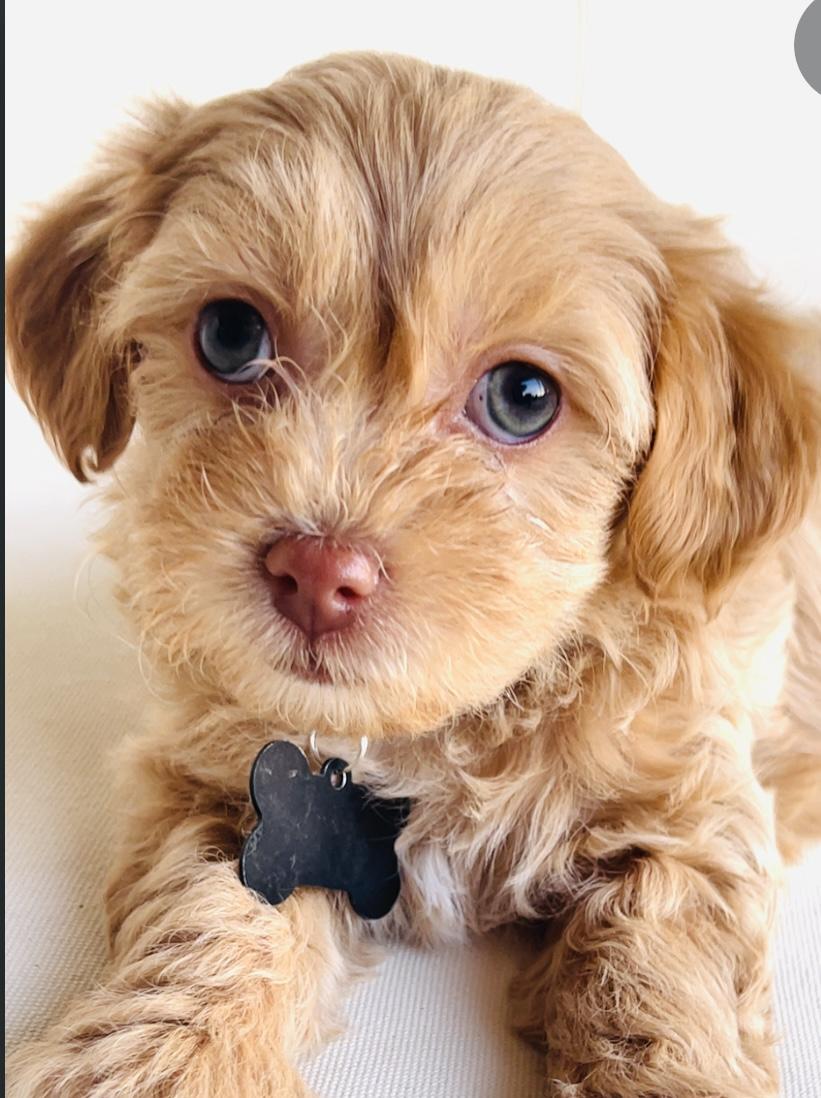 Daddy Milo is an apricot (light blonde) color with chin & upper chest in white. He has wavy, slightly curly hair