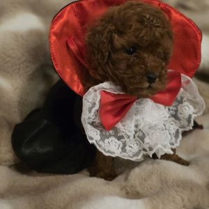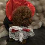 Spookie looks like he stepped out of a fairy tale—just the spooky kind with extra snuggles. Wrapped in his tiny Dracula cape, he’s not scary at all… he’s adorable. His fluffy ears peek out like little bat wings, and when he trots around, the cape flutters behind him like he’s on a magical mission to find cuddles.