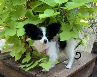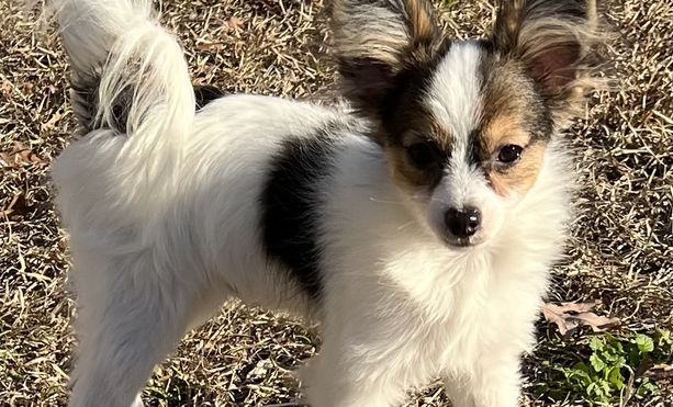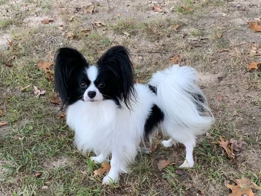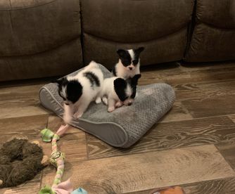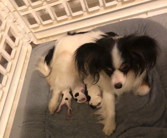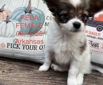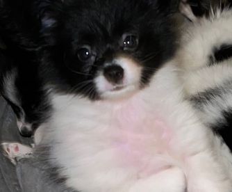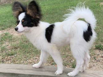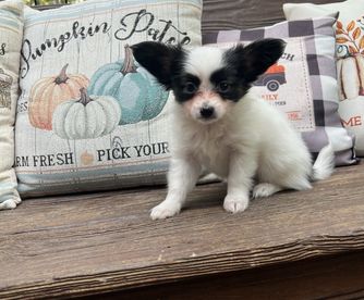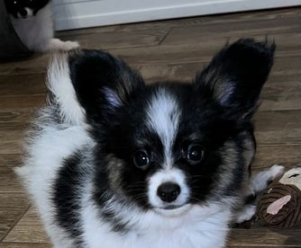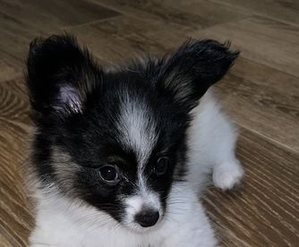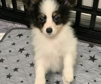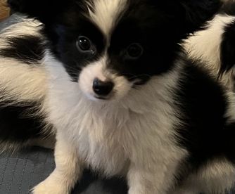 Our Papillon puppies include white and black and sable. Pomeranian puppies are orange sable. Colors will vary depending on the parent dogs.