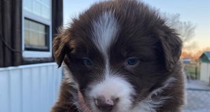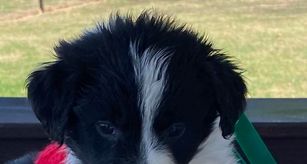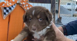Our Aussiedoodle puppies include red merle and red tri-color. Australian Shepherd puppies include red merle and blue merle. Miniature American Shepherd puppies are blue merle. Poodle puppies include brown, silver-beige, and parti. Colors will vary depending on the parent dogs.