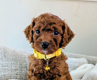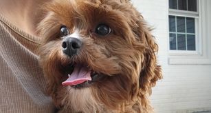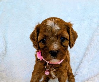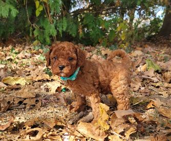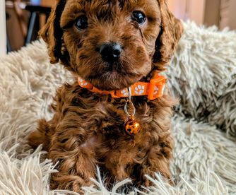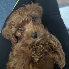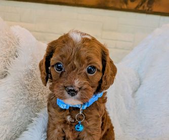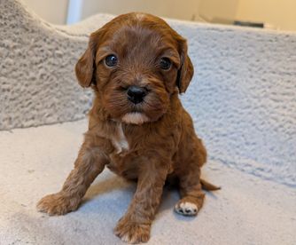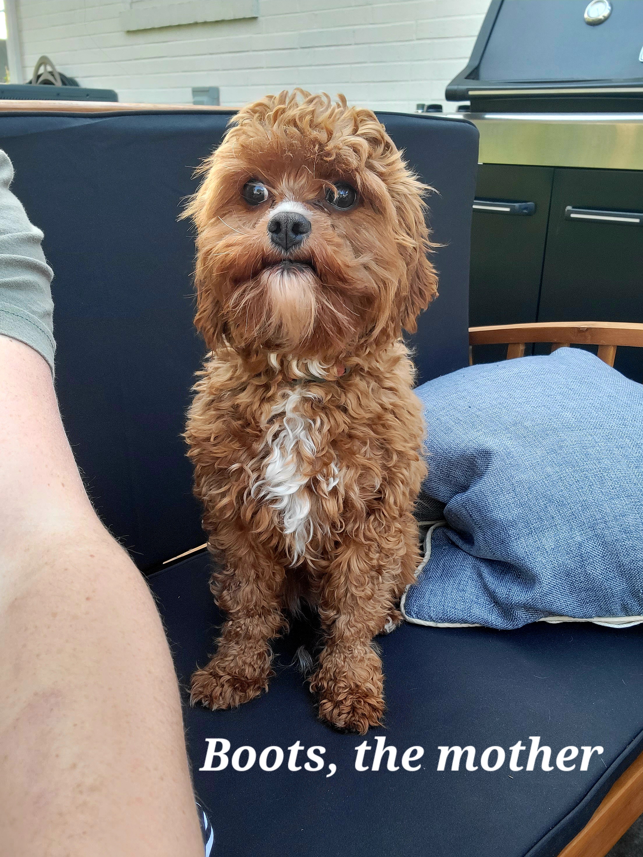 Boots is a super friendly, energetic F1 Cavapoo! She has a wavy red coat with some white markings. She is an excellent mama to her babies. She has had three litters and always cares for her babies so well!