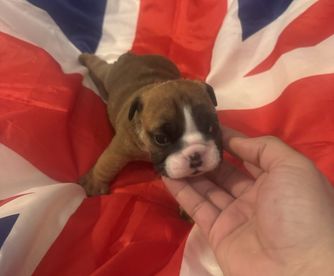 Our puppies are red brindle and white. Colors will vary depending on the parent dogs.