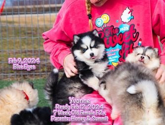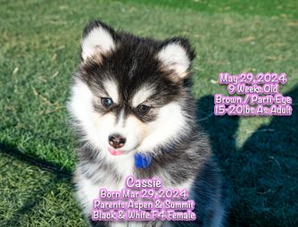 Check out this adorable little pomsky girl that comes out of Moana & Steele and she is gorgeous weighing in at 20lbs we can't wait to see what she produces for us. She a beautiful super soft coat and loves everyone.