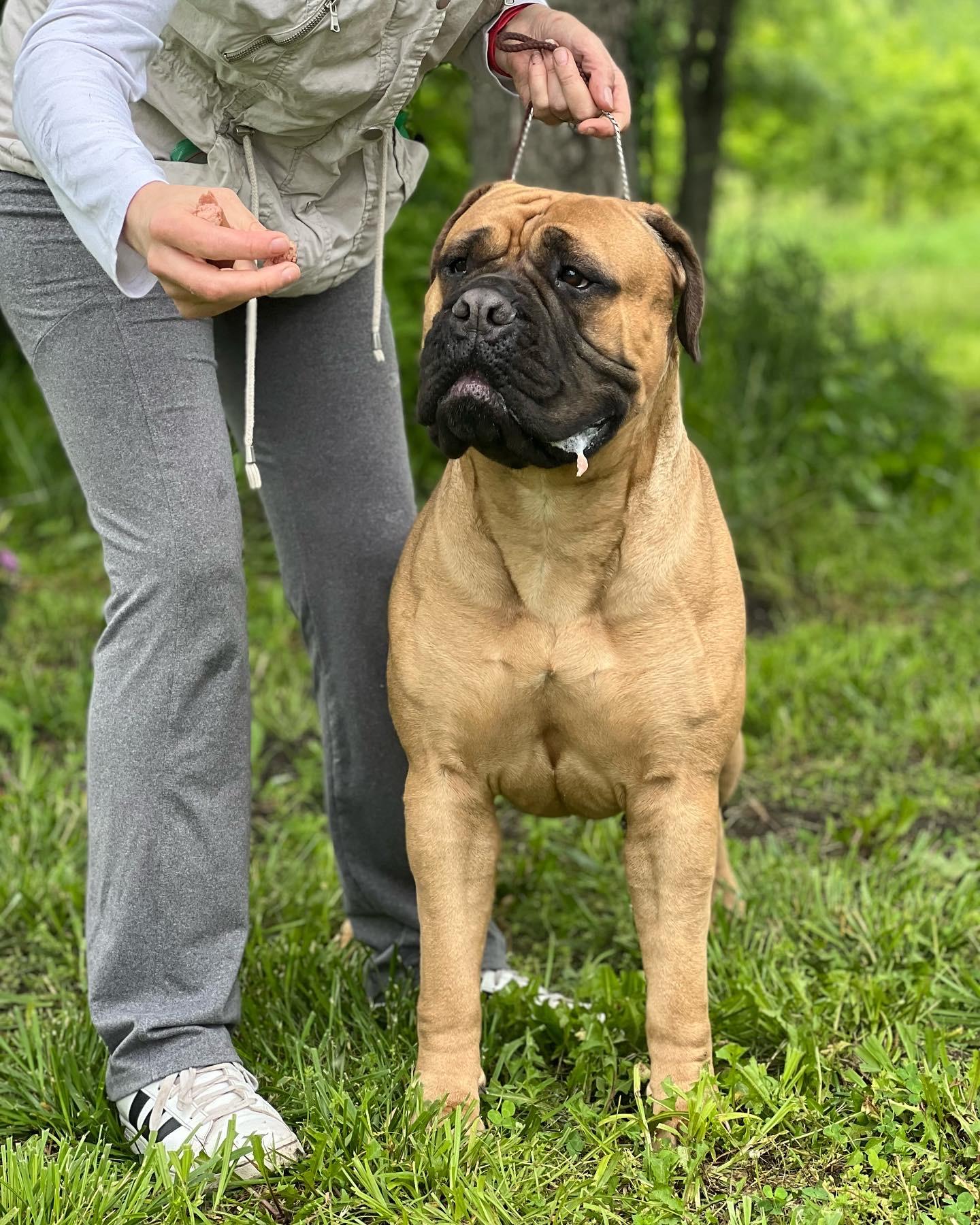 Chara is a female Bullmastiff. Carefully selected as a great representative of her breed, Galina decided to make her part of their program. Galina has passed Good Dog’s screening process, which involved a review of their breeding practices, environment, and the mental and physical health of their dogs.