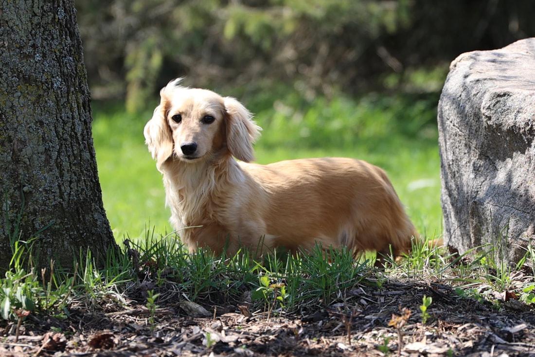 Daffodil is a female Dachshund. Carefully selected as a great representative of her breed, Mary decided to make her part of their program. Mary has passed Good Dog’s screening process, which involved a review of their breeding practices, environment, and the mental and physical health of their dogs.