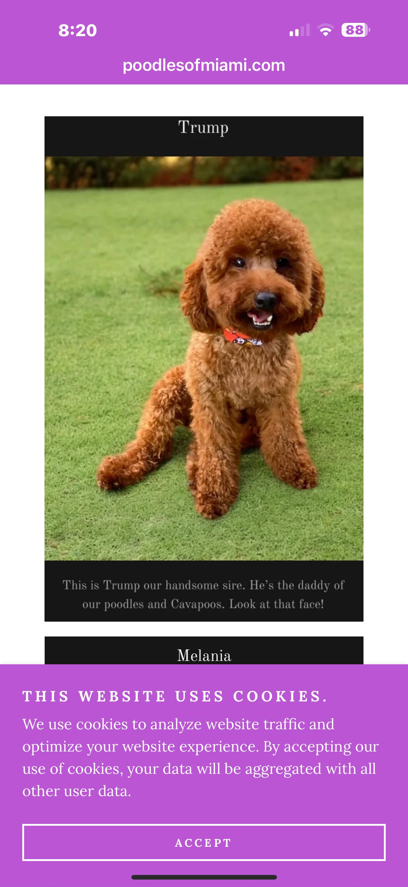 Trump is a male Poodle. Carefully selected as a great representative of his breed, Mario decided to make him part of their program. Mario has passed Good Dog’s screening process, which involved a review of their breeding practices, environment, and the mental and physical health of their dogs.