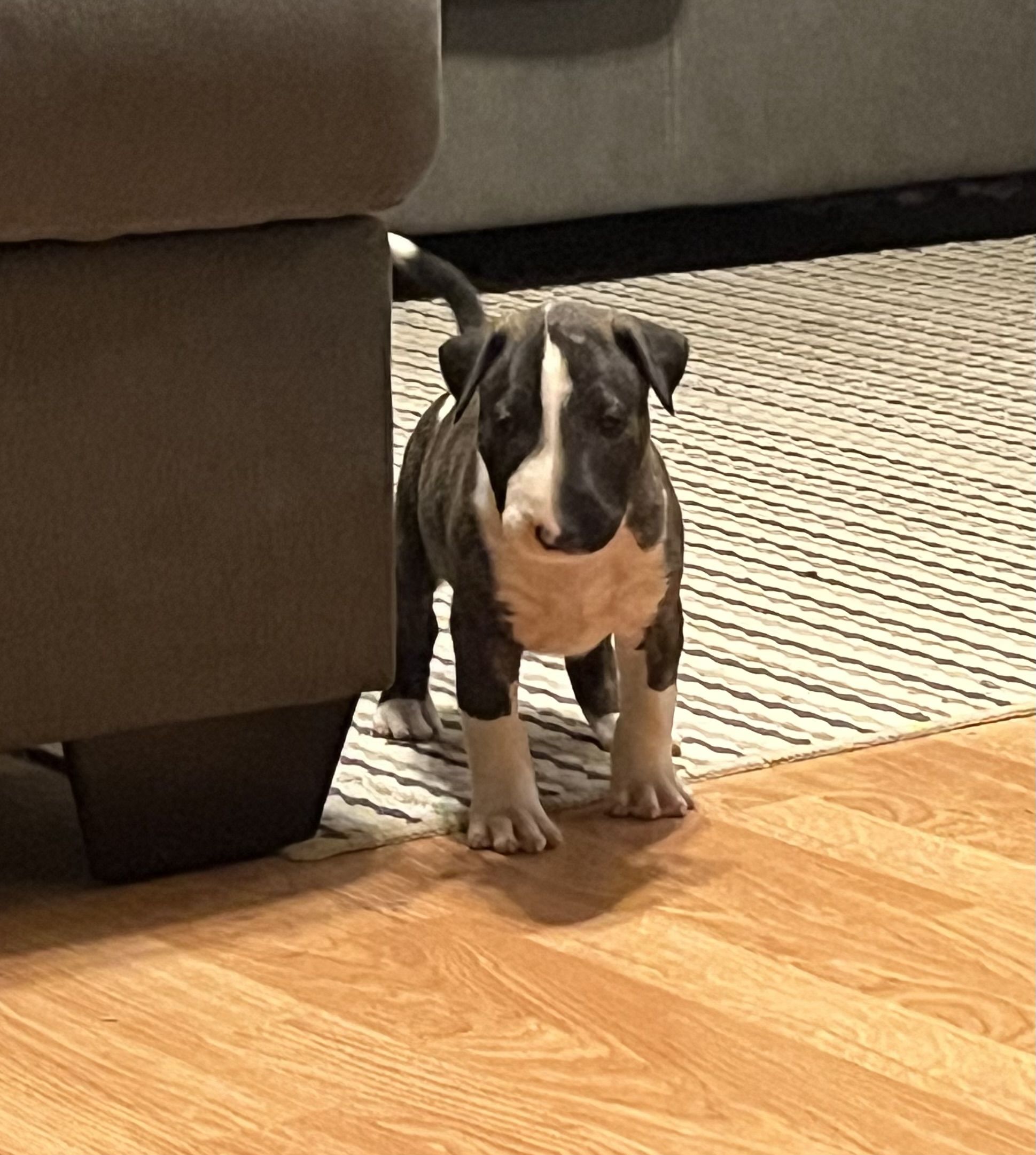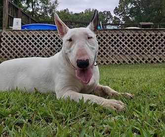 Nim is a typical female bull terrier. Very loyal to her family but is protective. She is smart, sweet and loves children. She has a bit of a drive but can turn it off. She is having one last litter then will be seeking a retirement home with no other pets and an experienced owner.