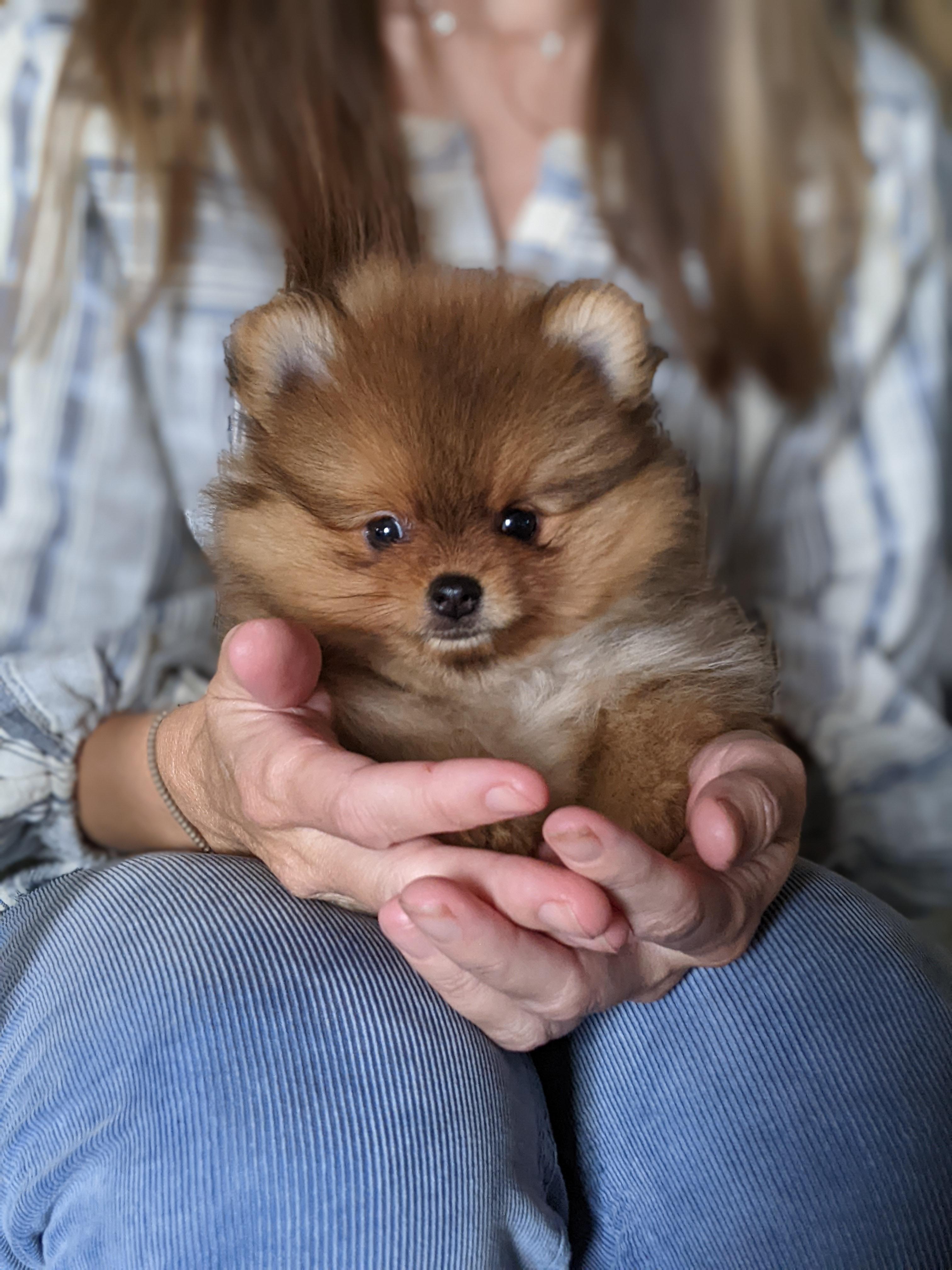 We only have 3 dogs that we breed. Our Poms are spoiled rotten in our home and our puppies are raised with us and socialized with our family and our adult dogs when they are old enough. They stay in our room when they are small so I can watch over them. Our goal is to breed show quality poms, whether you decide to show them or not. Personality and health are priorities and we will not breed a dog with a known defect. We want to better the breed and share the love we have for these sweet poms!