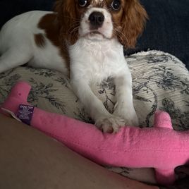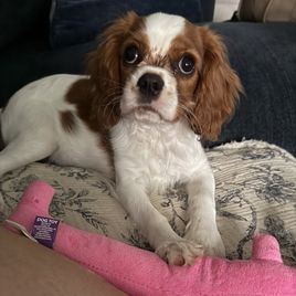 My name is Heather and my dogs name is Ali. She comes from someone. I really don’t know Martha Cavaliers and the dog she gave me is perfect. I love love love with all my heart. She is not only perfect to love and give love but she’s very smart. I think her name was Mia at first and we went with Ali and she knows her name. I am 63 three years old and I am training her to be a good pet to everyone. I am two very small grandchildren and five and three and she’s going thru the chewing and bitting phase it seems as though my grandchildren are taking the brunt of that phase. She does not hardly ever bark so when I hear her it’s just the cutest darndest thing I’ve ever heard. when you talk to her and it’s not good, she tilt her head in such a way that it’s so hard for me not to be a little tickled. Her favorite thing to do is believe it or not a plastic water bottle she can play with that longer than any of the toys that I bought her and she has plenty she is now she was born on April 12. She’s already four months old. It’s crazy. She does have sharp nails I’m unable to do her toes because I have a disability, but I had my husband watch them do it at the vet so I would know exactly how it’s done and how not to hurt her and I bought a nail grinder or a nail cutter. I have both so that’ll make some of these job a little easier this is what happened when I got Ali from my breeder Marta it was love at first sight.