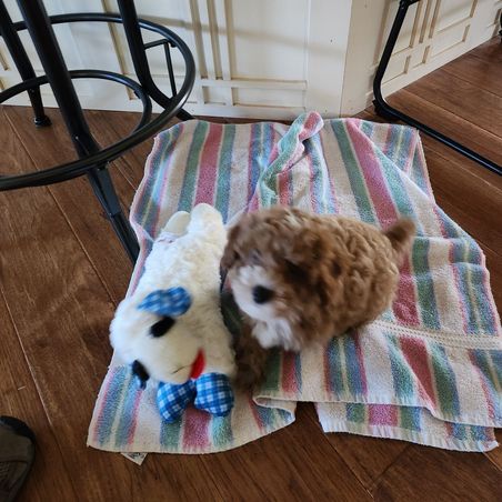 Stephanie was great to work with. She really cares about her puppies and Snoopy is a well adjusted puppy. He's very smart and seems to catch on very quick. We're working on the potty training with him and he's doing very well with only the occasional slip. But he's doing great for only 10 weeks old. we're also doing leash training and he's doing very well with that, too. We're happy that we found Snoopy and Stephanie and so glad to add them to our family.