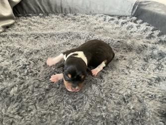 Our puppies are black white and tan. Colors will vary depending on the parent dogs.