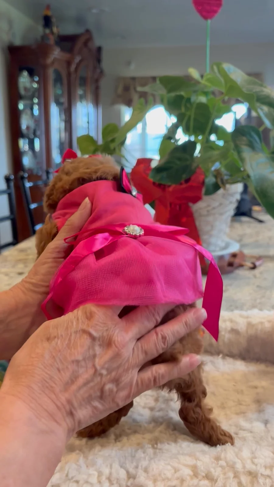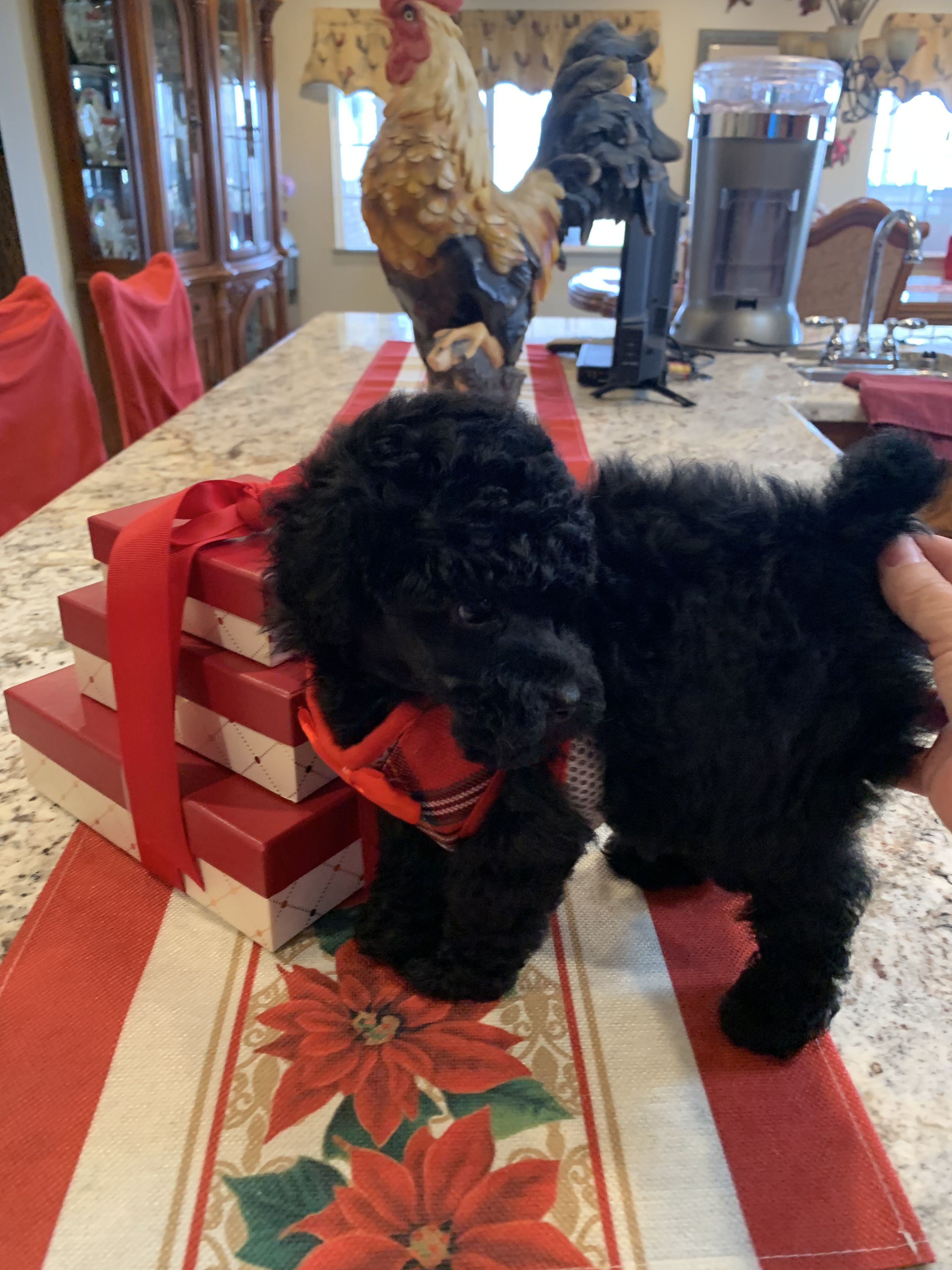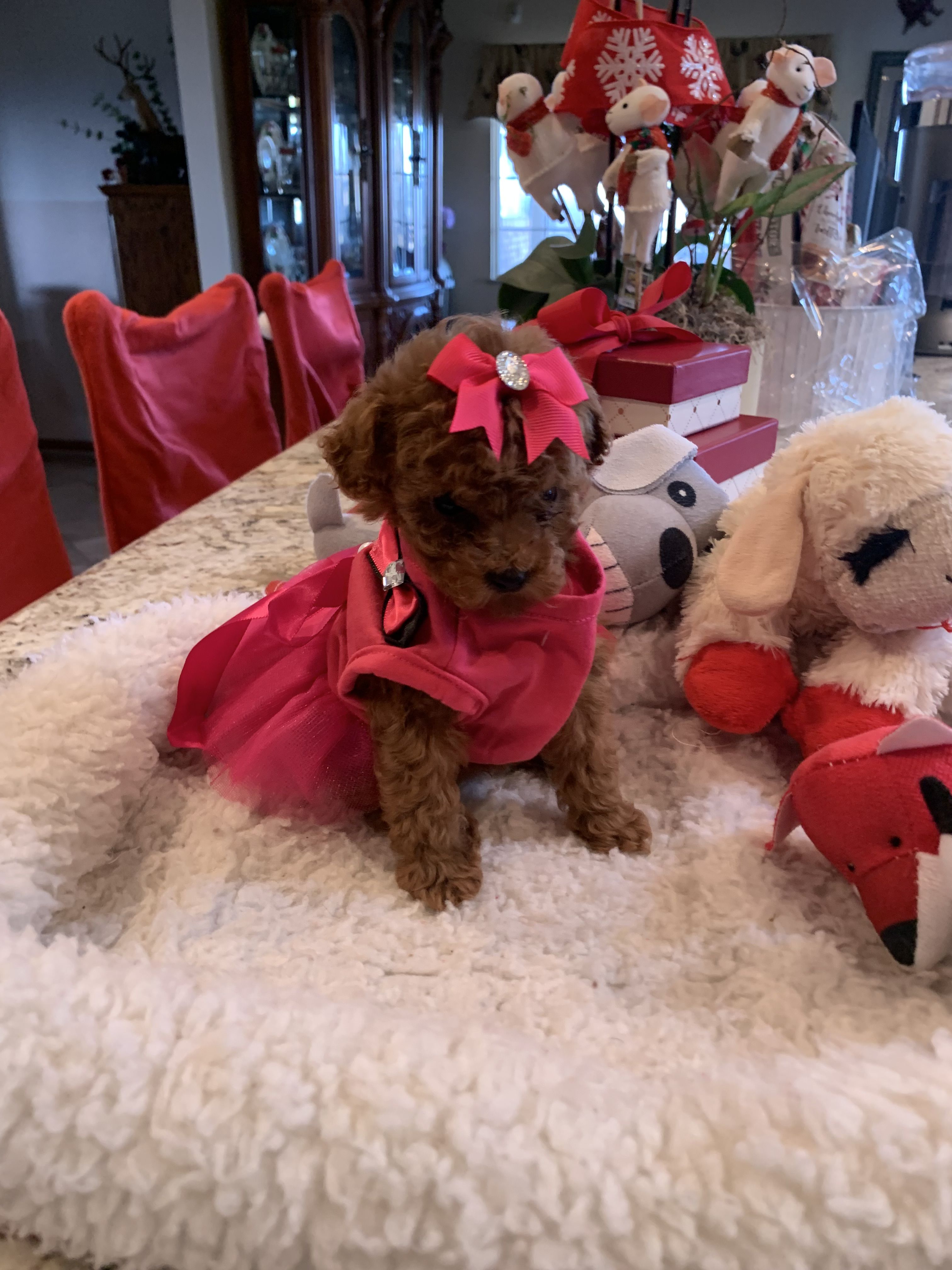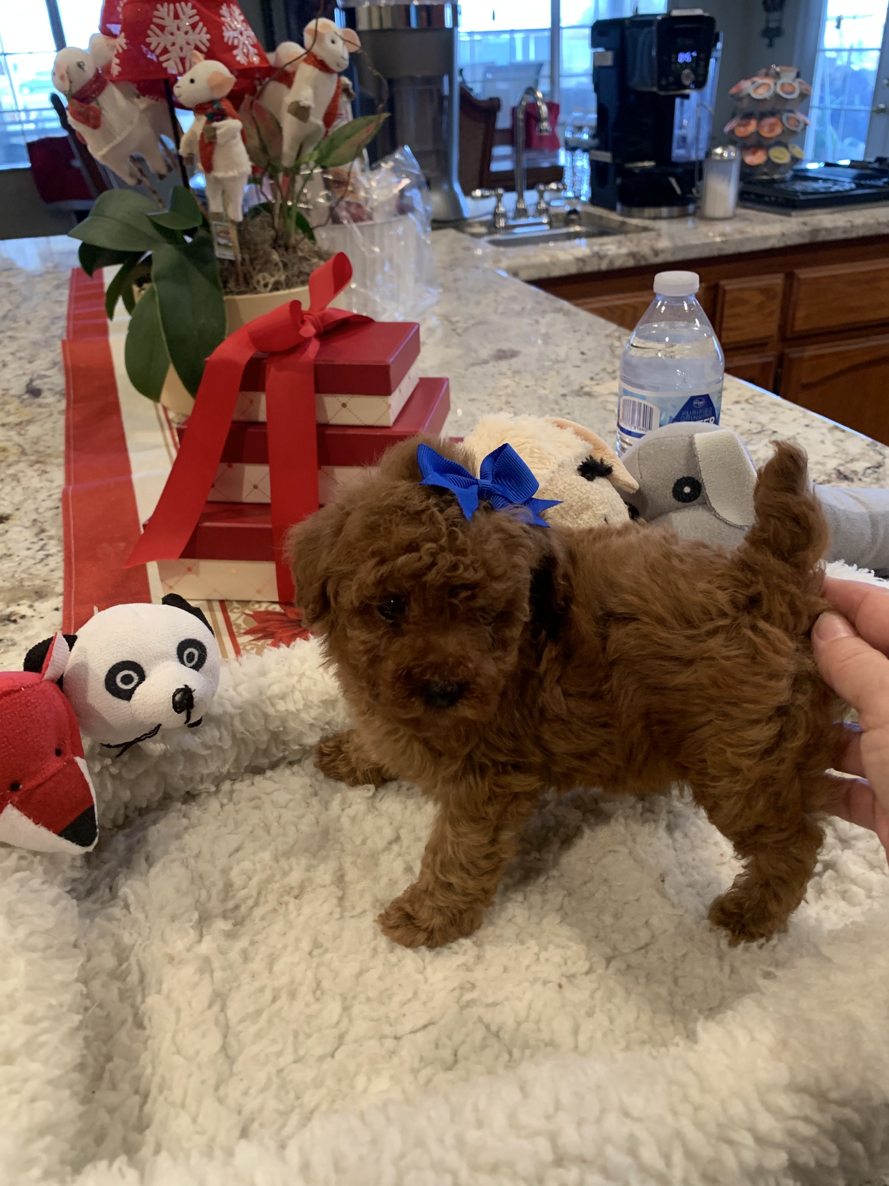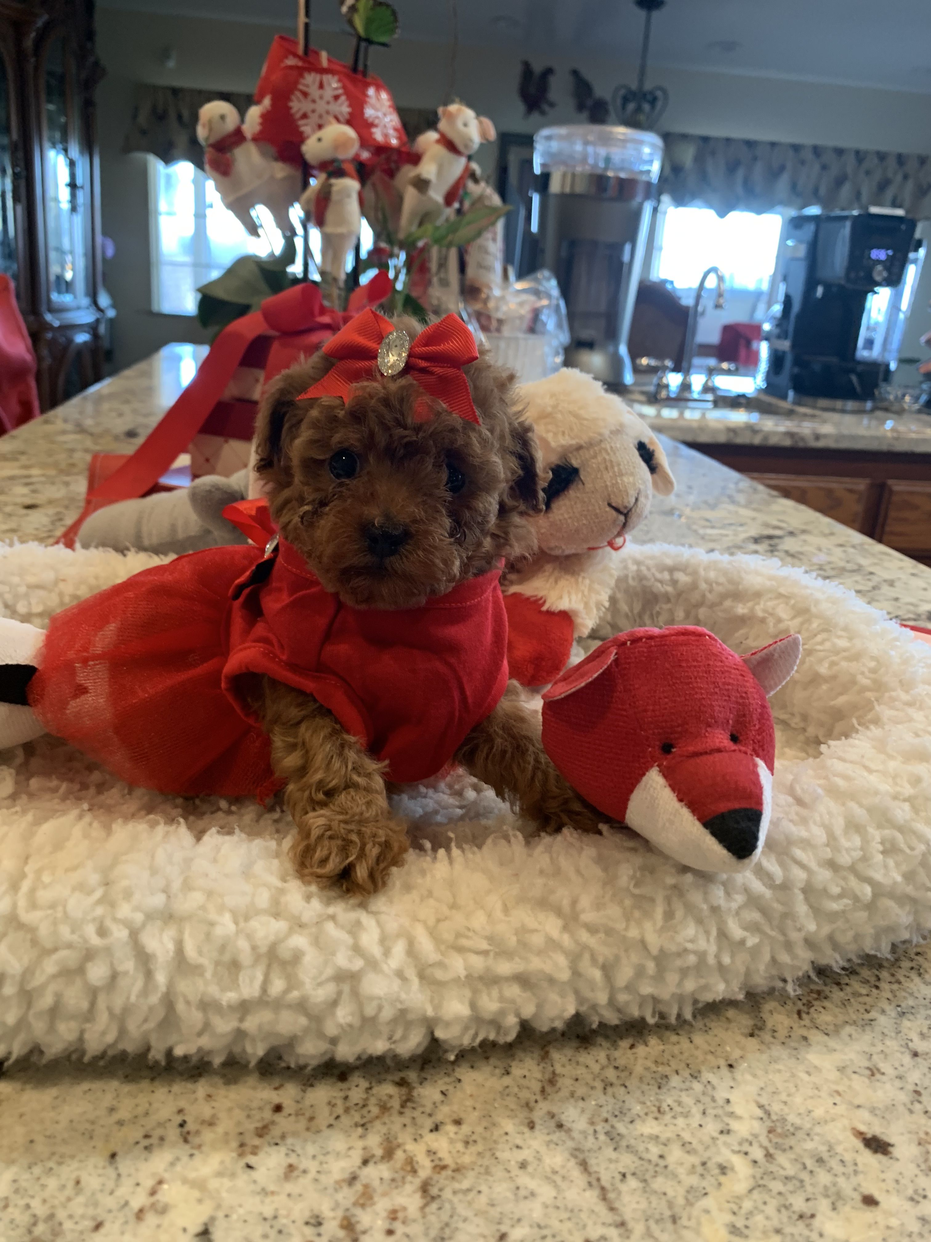 Amazon is a beautiful red Tiny Toy male great coat great temperament does well with others dogs and cat loves his belly rub.