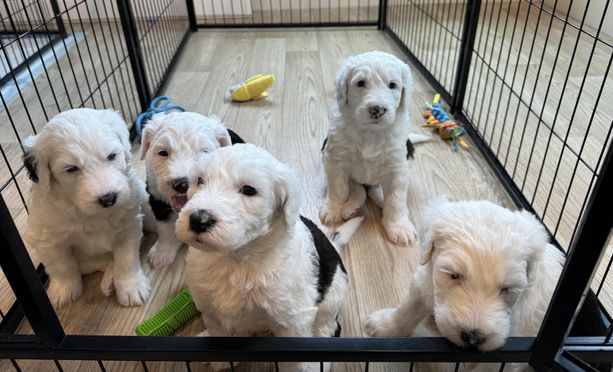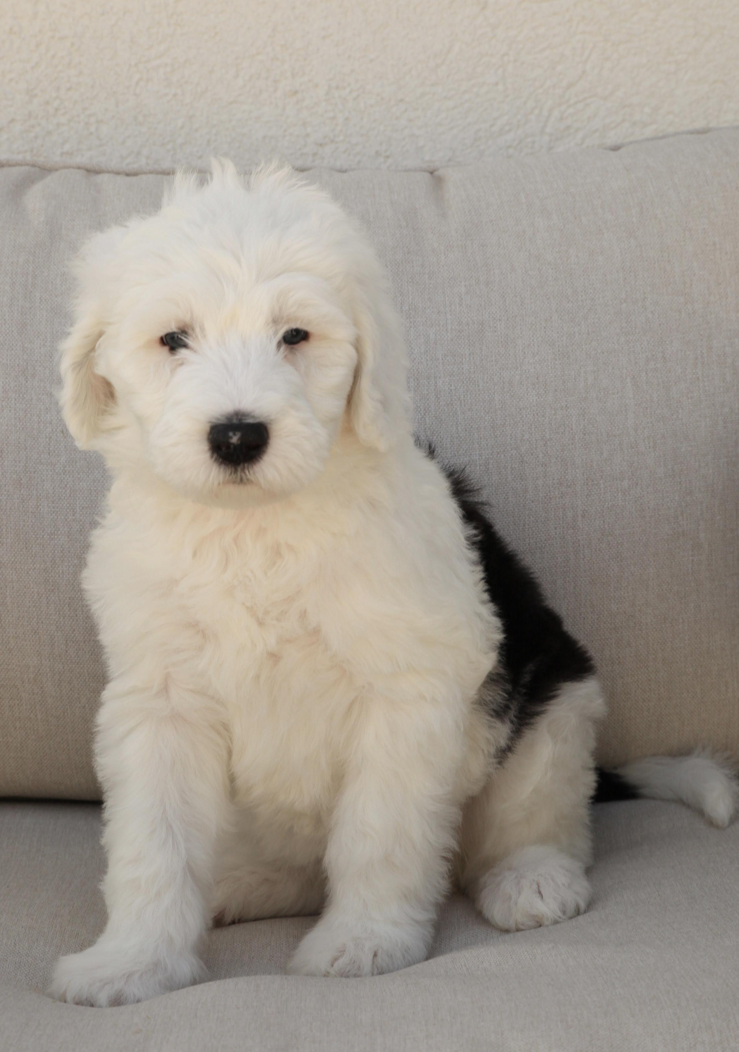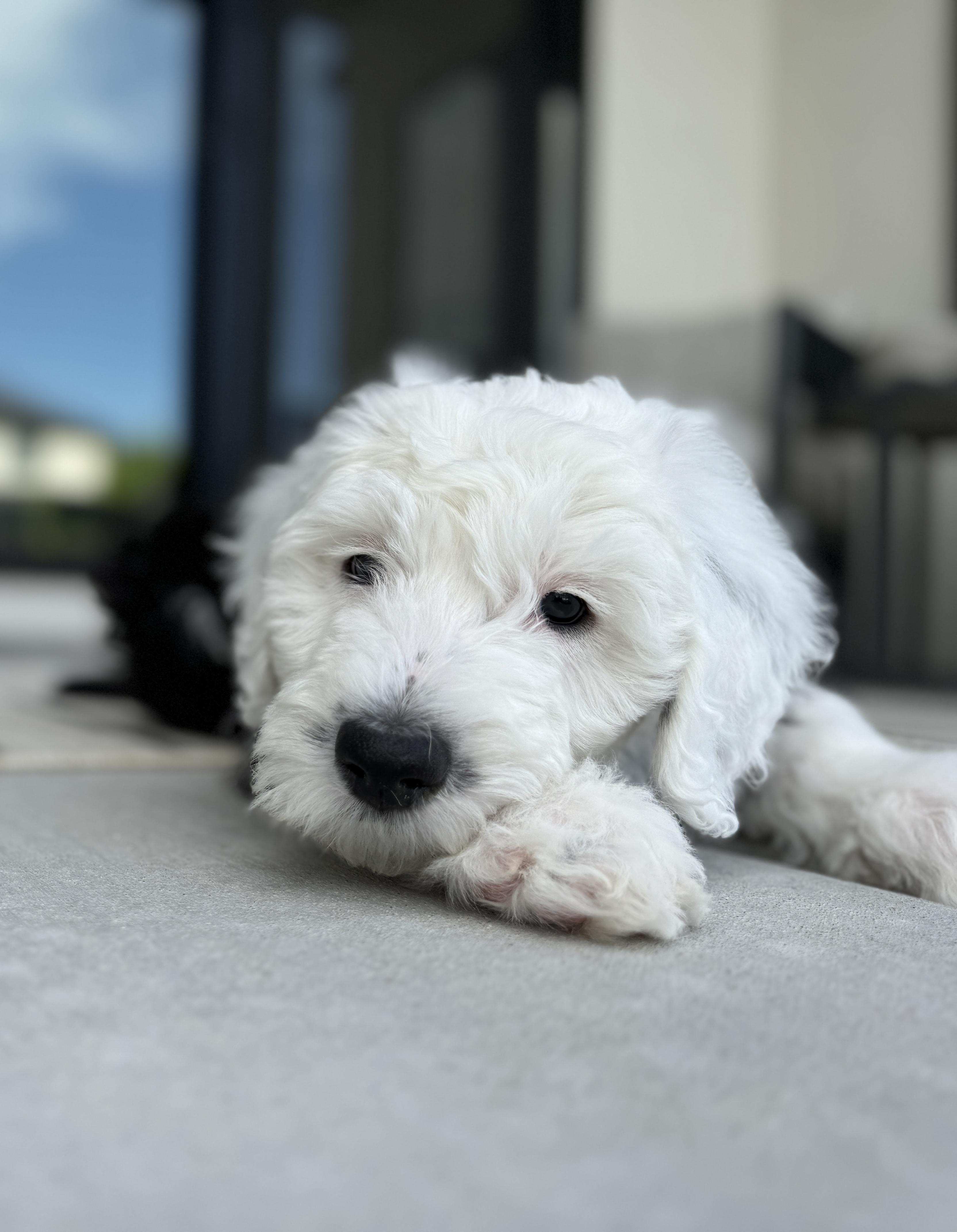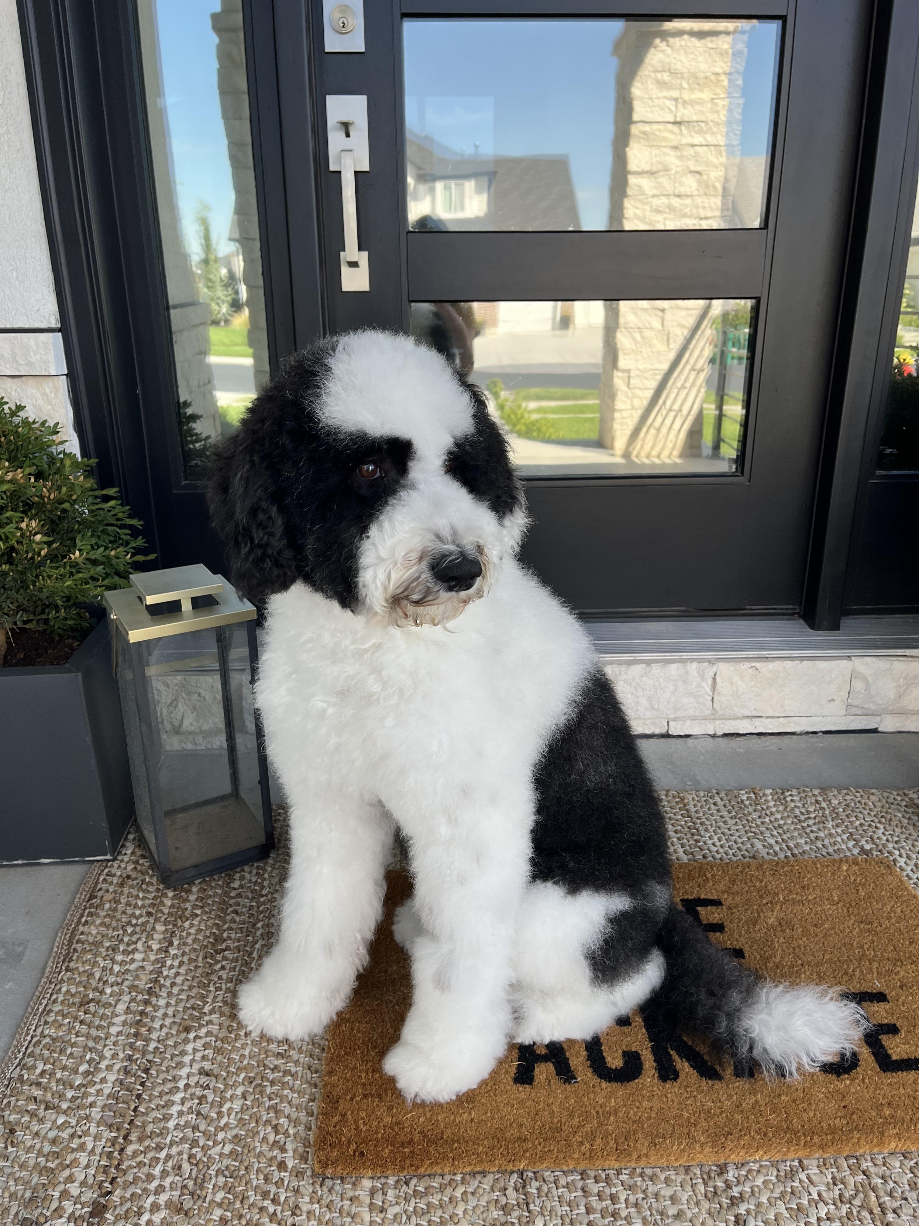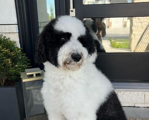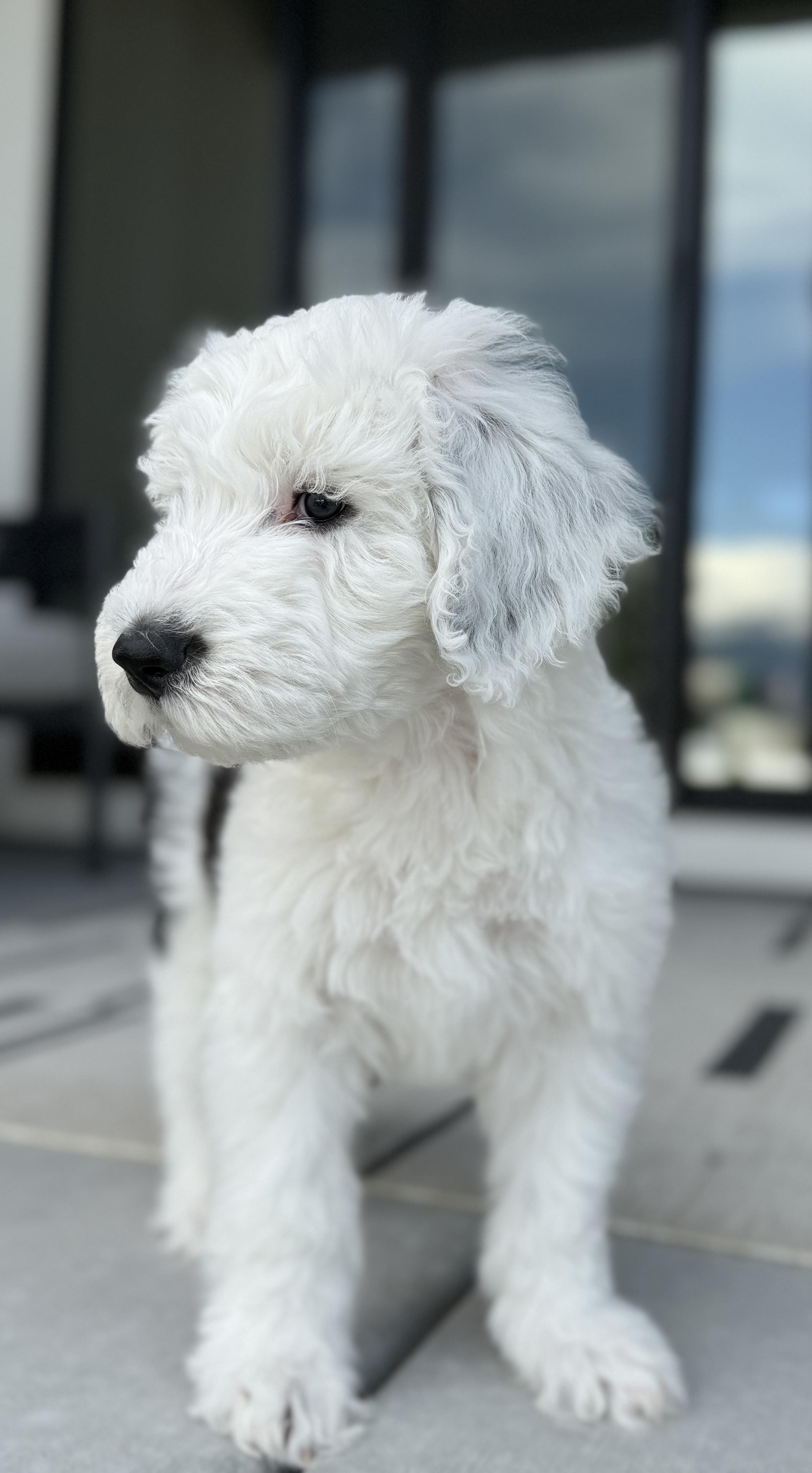 Marz is an F1b Sheepadoodle with an amazing temperament and personality. She is very obedient, super smart, and an amazing family dog.