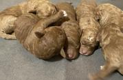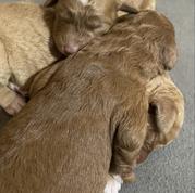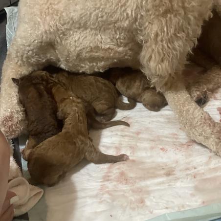 Our Daisy girl is giving birth!! So far 6 red Goldendoodles 2 boys and 4 girls!!