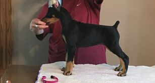 “Price includes cropped and docked ears, vaccinations, health testing, AKC Registration. Both Sire and Dam have been health tested. Puppies are raised in my home and are crate trained before they go to their new homes. Deposit if refundable if we do not have a puppy for you.”