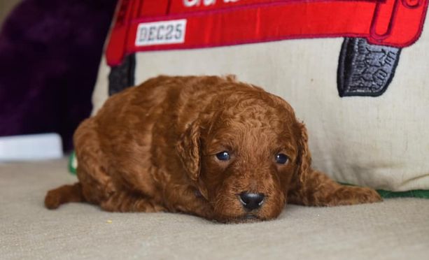 This will be Finley’s retirement litter. She just wants to go on walks, car rides or just snuggle with you. She’s an excellent mother to her puppies. She’s health and genetically tested.