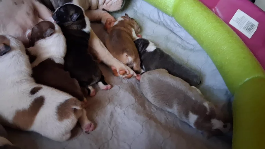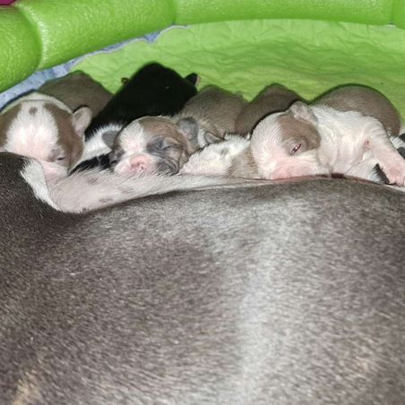 Our puppies include seal brindle and white, seal and white, black brindle and white, brindle and white, and black and white. Colors will vary depending on the parent dogs.