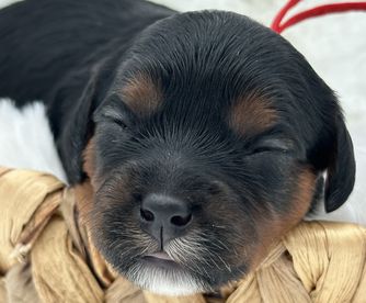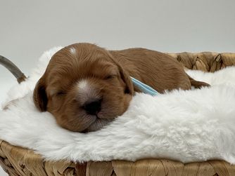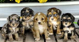 Our Aussiedoodle puppies include blue merle, red merle, and black and white. Cavapoo puppies include merle, sable, tri-color, brown, black and white, black and tan, and apricot. Cavalier King Charles Spaniel puppies are blenheim. Colors will vary depending on the parent dogs.