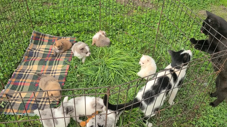 Our breeding program is different from some others because our pups are raised in our living room. During their time with us they get a ton of socialization, and experiences. Our puppies get a lot of socialization time with the kids, cats, dogs, and adults within our family. We also play with them in many different spaces so that they can adjust well to their new homes.