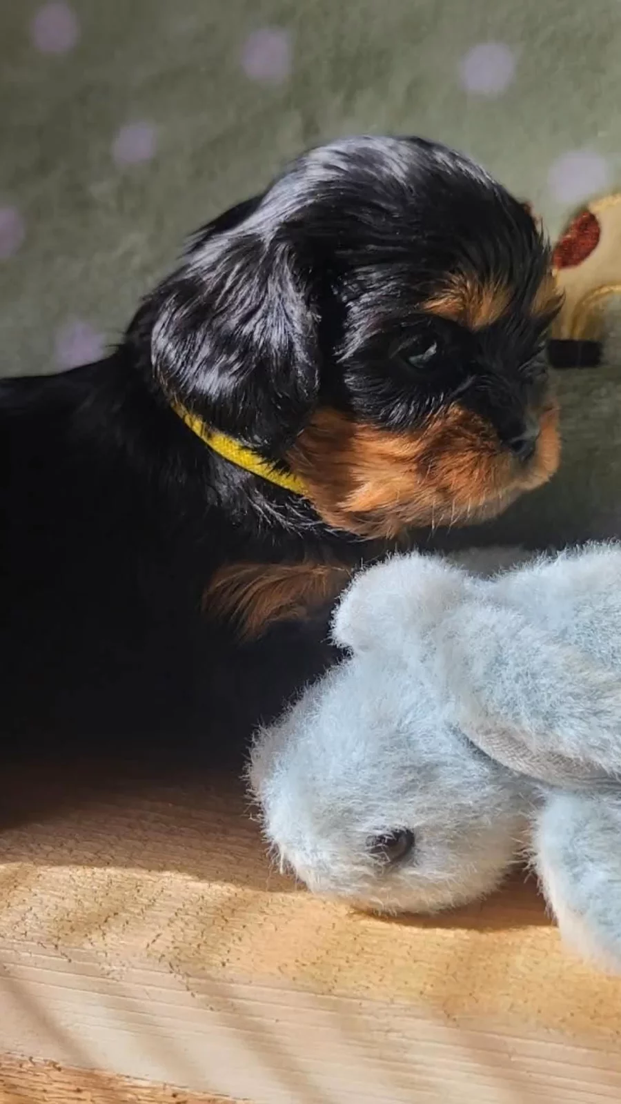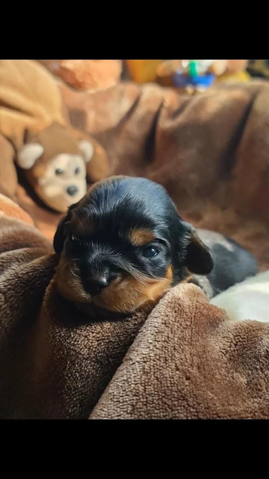 Tetley is the sweet little black and tan Cavalier that has earned the nickname "Tiny Little Tetley". For a first-time mother, Tetley has really impressed us. She is a natural, raising some absolutely beautiful babies. Tetley loves to be with her people and loves to cuddle and hang out on our laps. Cavaliers are the best!!