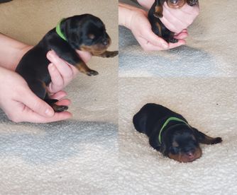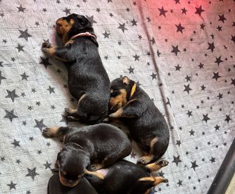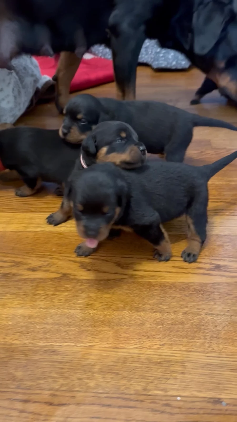 Puppies are trying a new surface. Eyes are open and walking around like crazy. 3 weeks old.
