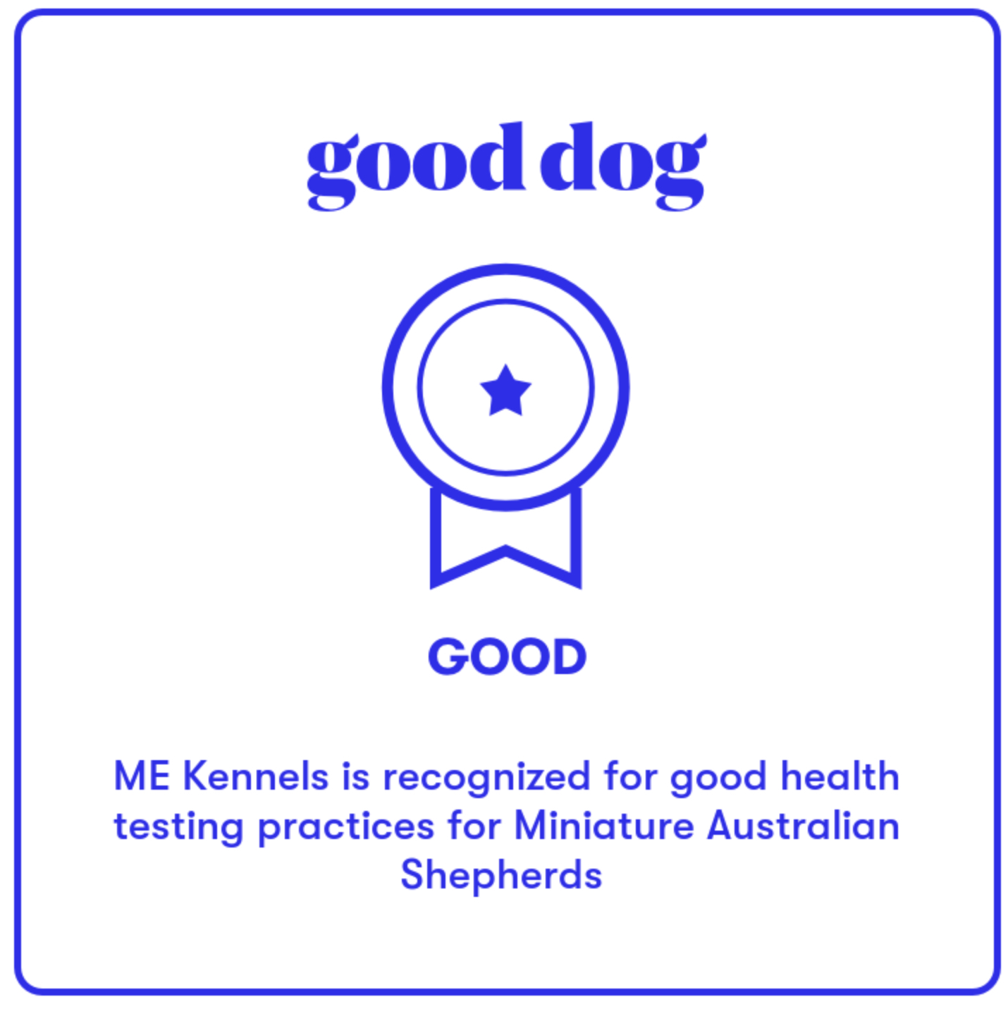 ME Kennels reports to performing the health tests below on their breeding dogs. Ask your breeder about the tests performed on the parents of your litter. Learn more about health testing for Miniature Australian Shepherds.