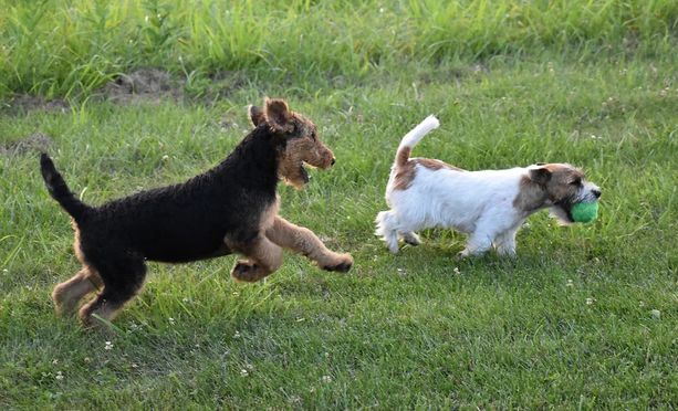 Our Russell Terrier puppies are white and tan. Airedale Terrier puppies are black and tan. Colors will vary depending on the parent dogs.
