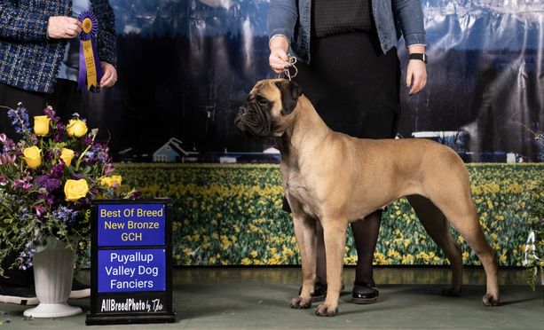 Jenny is the epitome of gentle giant! She has the sweetest temperament and stellar work ethic which made obtaining her canine good citizen advanced and canine good citizen urban a breeze. She has been very successful in the show ring as well obtaining her Grand Champion Bronze before the age of 2 as well as many breed wins, Best of Opposite at the 2024 Cascade Bullmastiff Club specialty and regular group placements. She is currently ranked number 16 Bullmastiff even after taking many months off to become a mom!