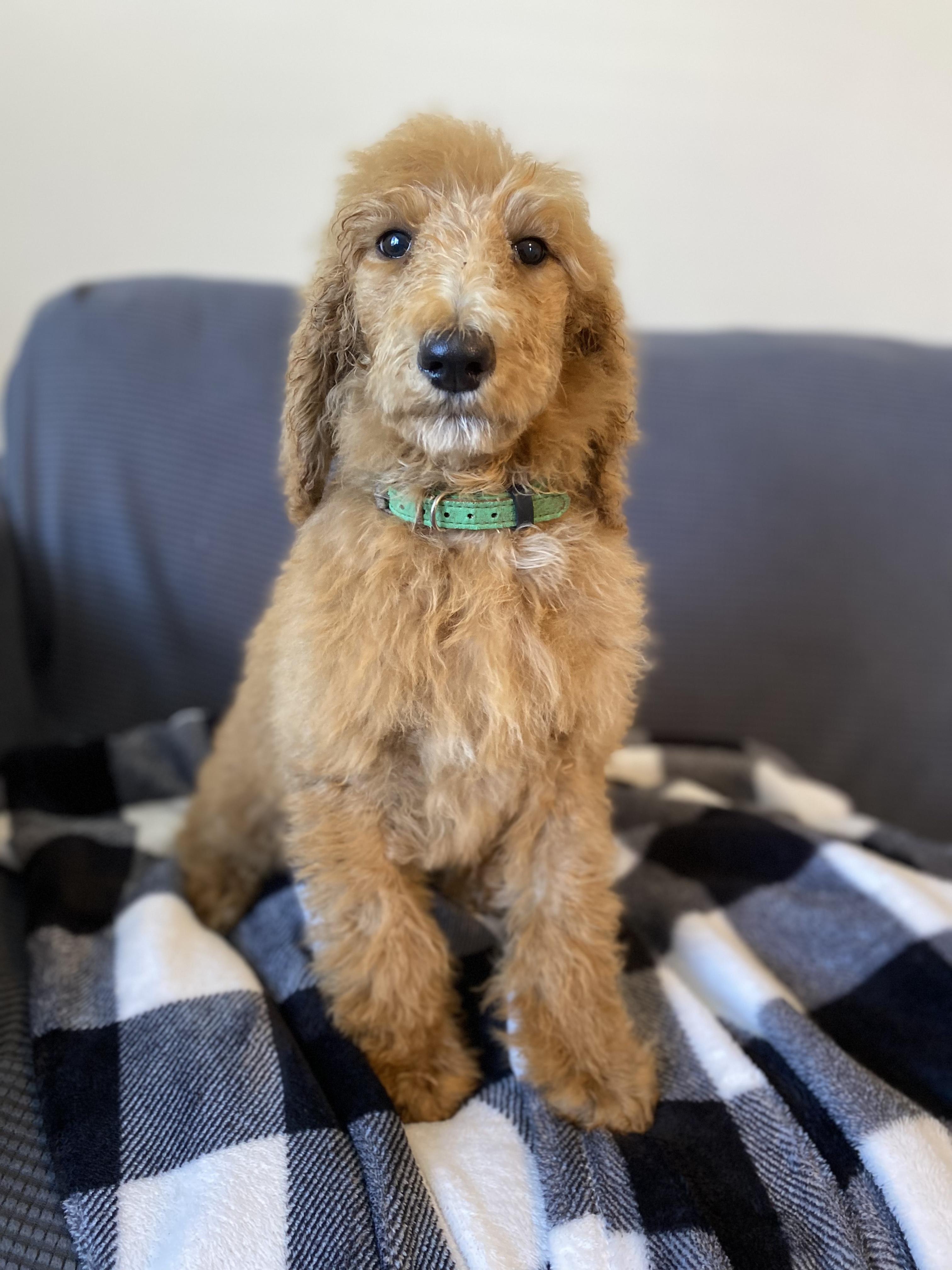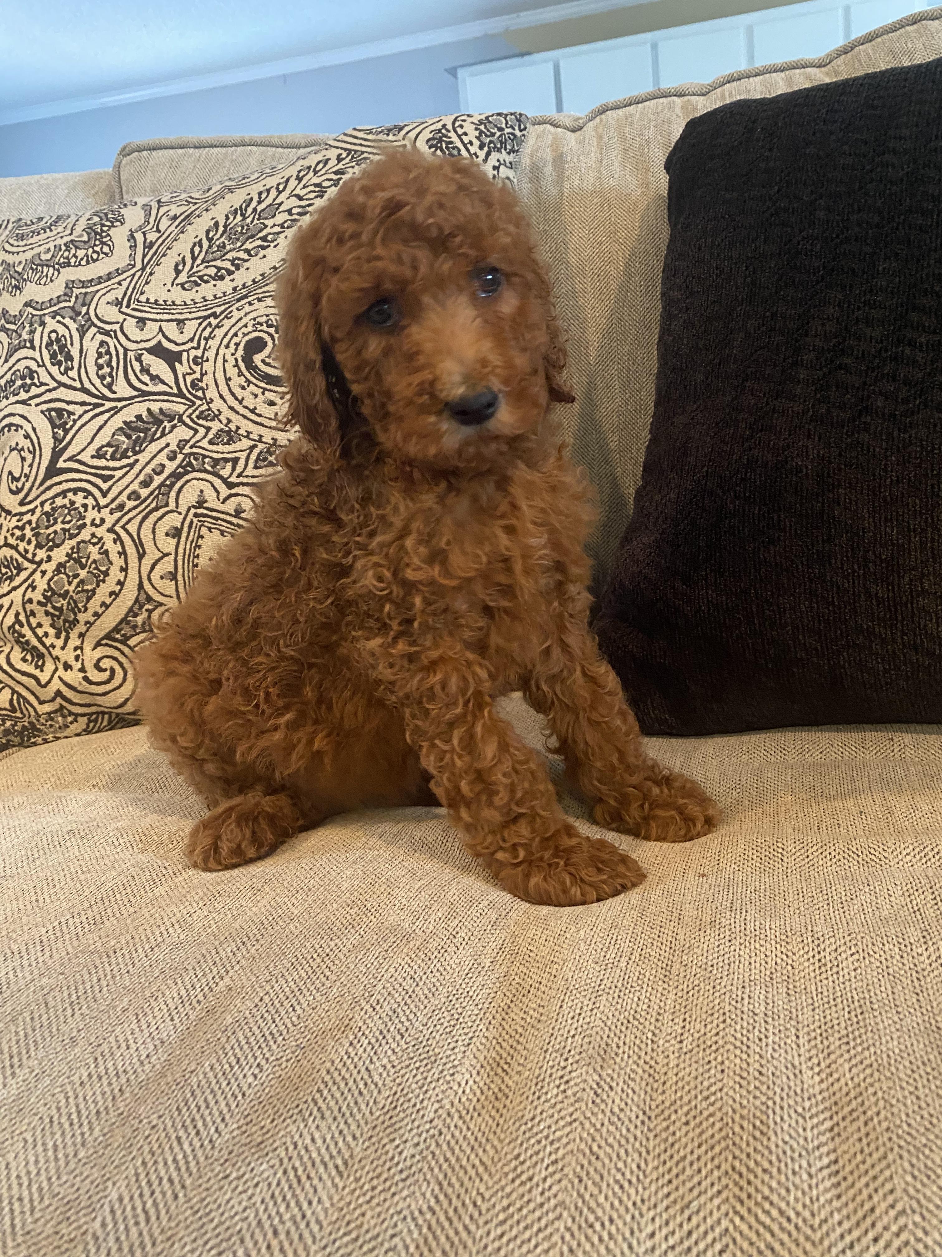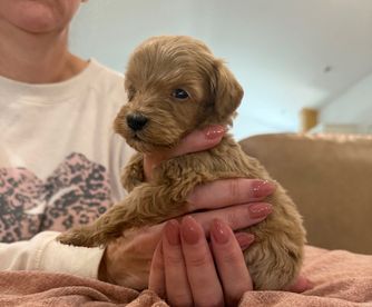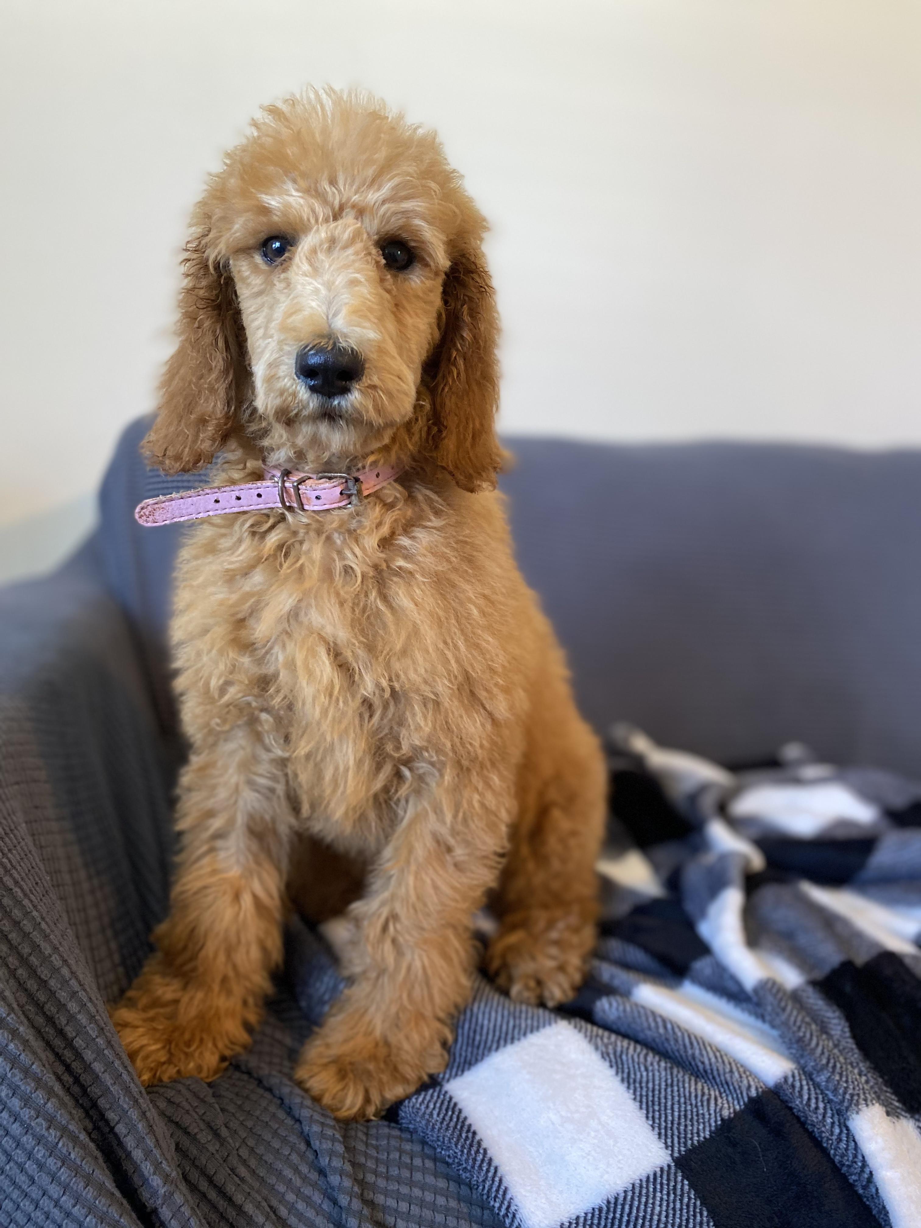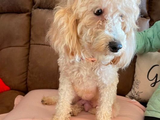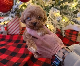 Ellie is such an all around great dog!! She is so full of energy and life and love! She is a micro mini Goldendoodle. She weighs 12 lbs and she is a light red with white on her chest and feet!