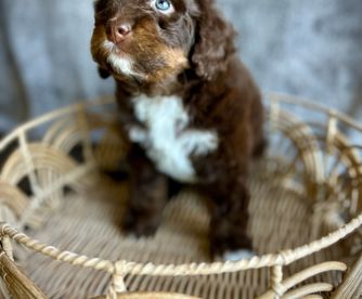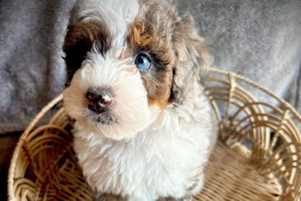 Bernedoodle puppies include brown, tri-color, and blue merle. Cockapoo puppies include merle, brown white and tan, black white and tan, and black and tan. Colors will vary depending on the parent dogs.