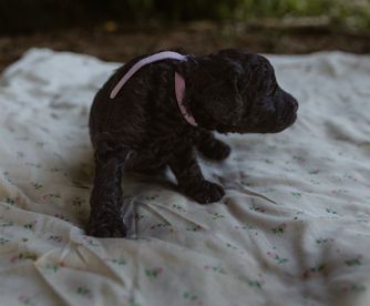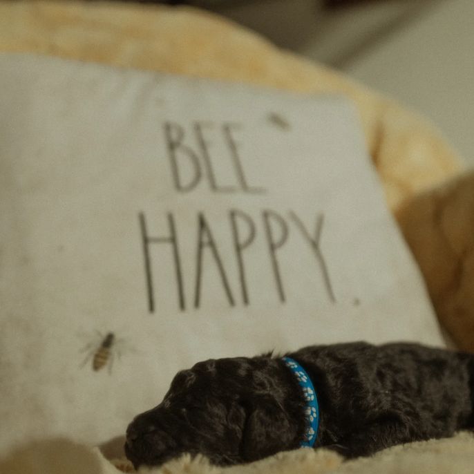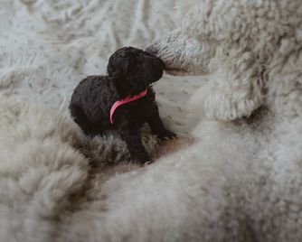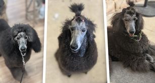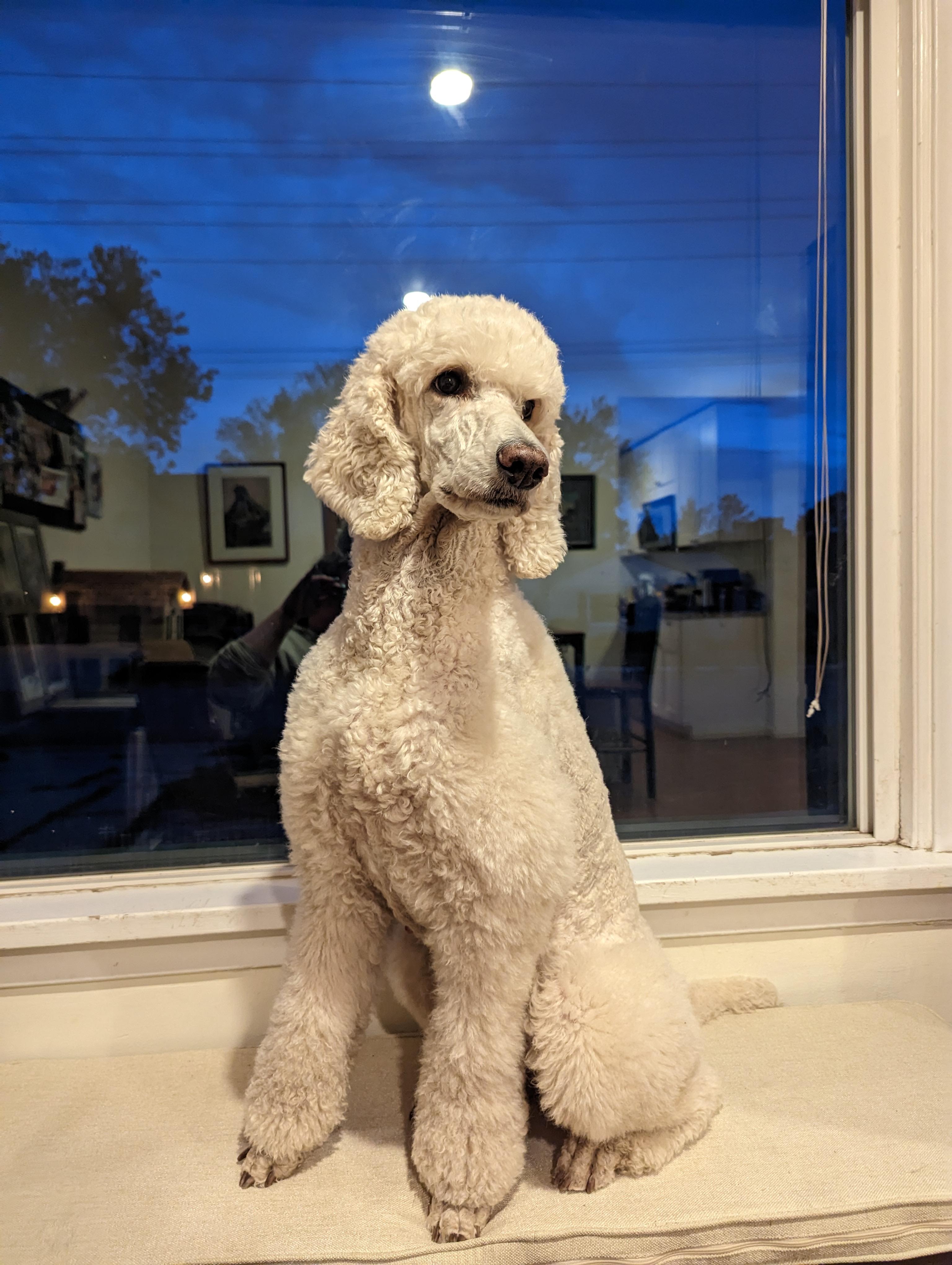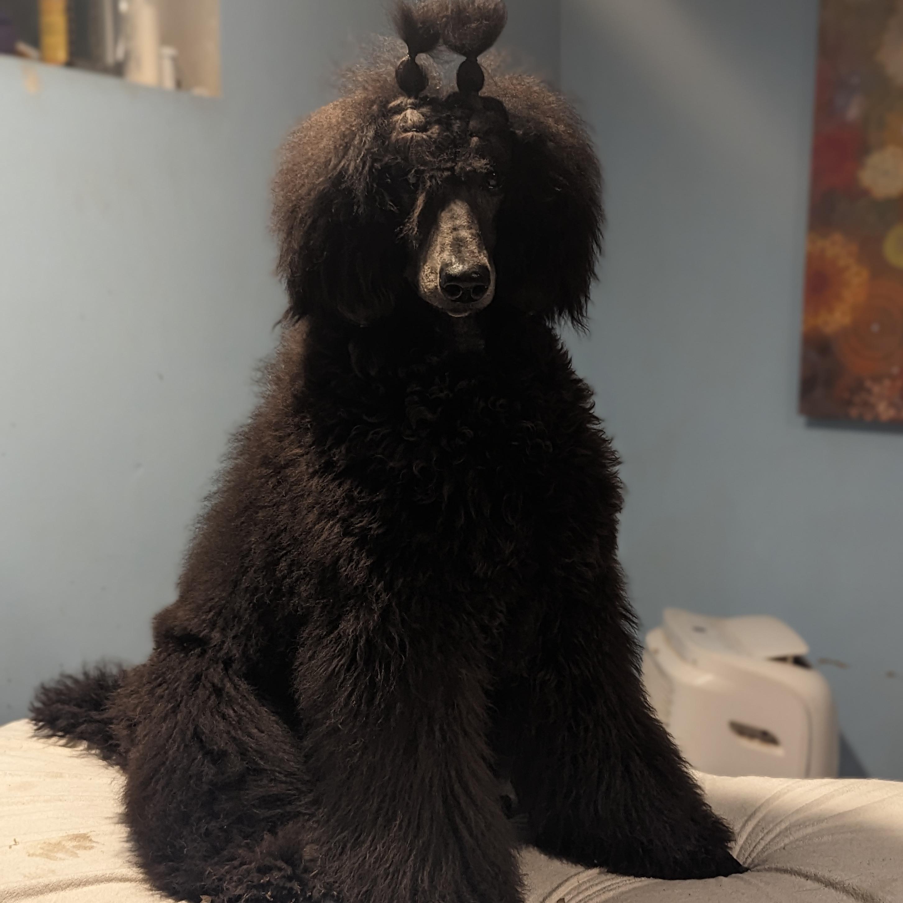 Lyra, Lottie, and Comic; no but really. Lyra was my first poodle who was bred to be a competitive groom dog, she has coat for days. She hated competing so she lives her life as a certified therapy dog. Lottie my little spitfire became my absolute baby. She is intuitive to my needs, and my shadow. And Comic is my cuddly ding dong. My breeding program is special because my dogs are amazing.