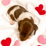 Luna is gentle-natured and loves playing fetch! She’s very protective of her family and is extremely affectionate. She is fully AKC Registered as a Chocolate and Tan Piebald Dapple.