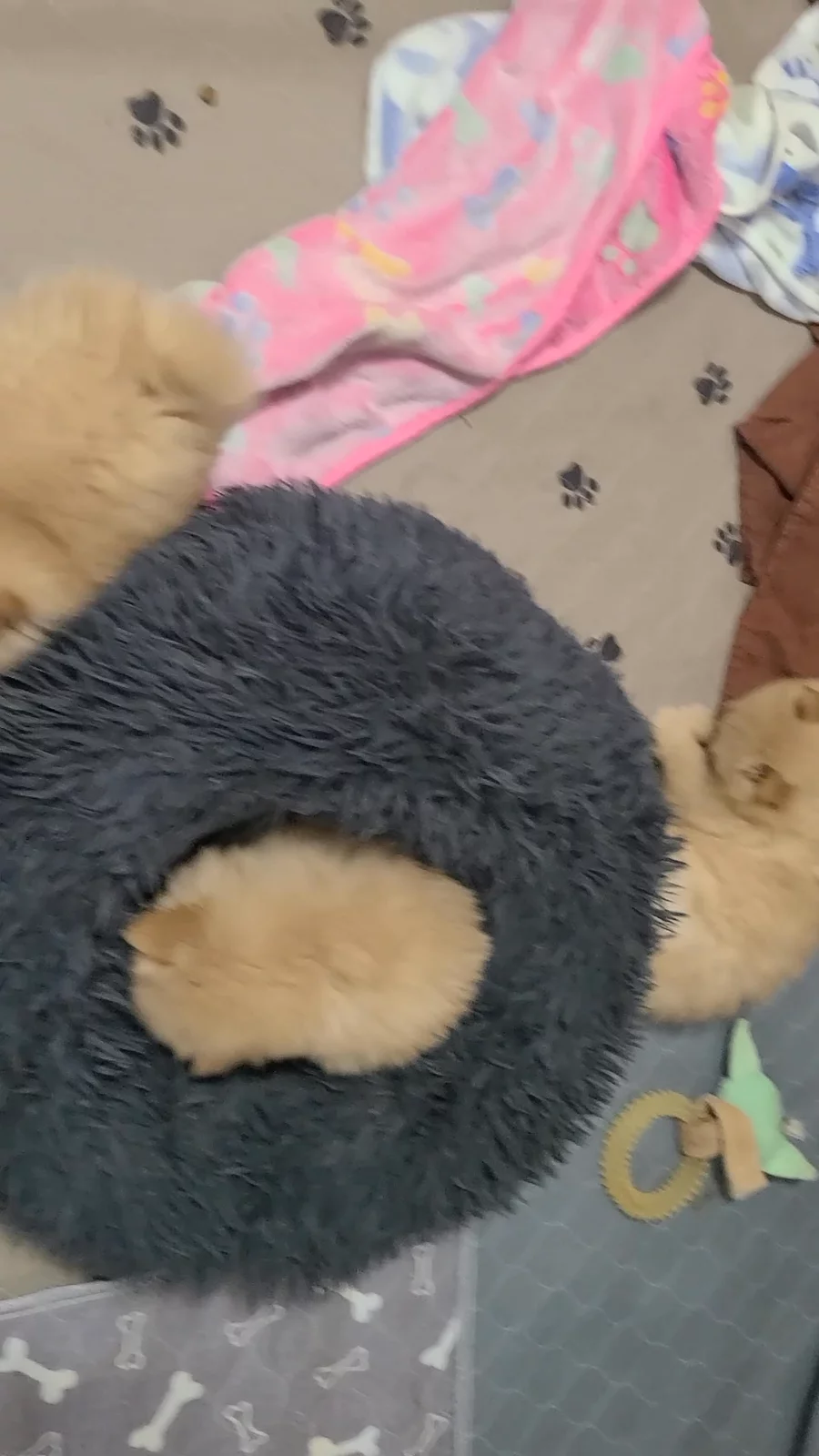 Fred laying on my arm. Fred is playing with Pink, my 4 lb pomeranian.