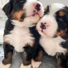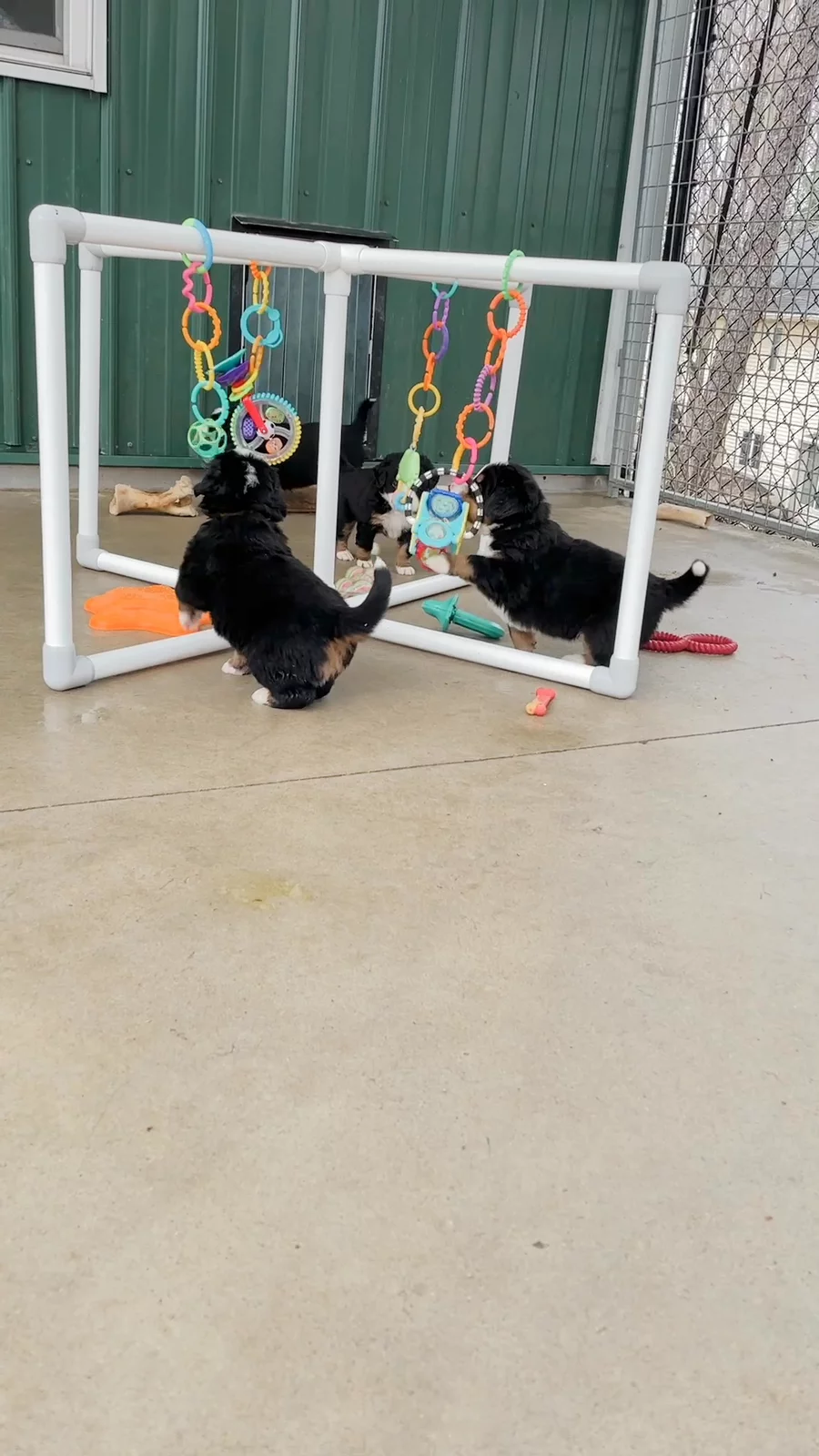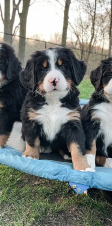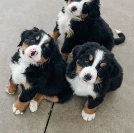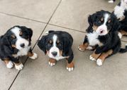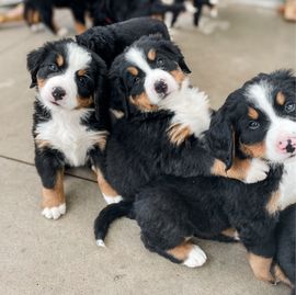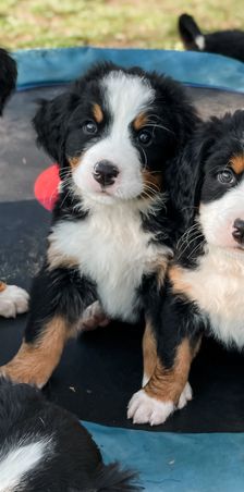 Our Bernese Mountain Dog puppies are black rust and white. Bernedoodle puppies are tri-color. Colors will vary depending on the parent dogs.