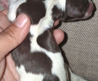 Koba is a liver parti roan Megacoat. He is food motivated lovable and chill. He is AKC/CKC/APRI registered.
