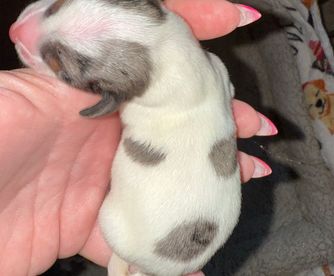 Chip is the sweetest boy ever!! Snuggly and gentle. He’s a chocolate piebald. He loves to play! He is AKC registered.
