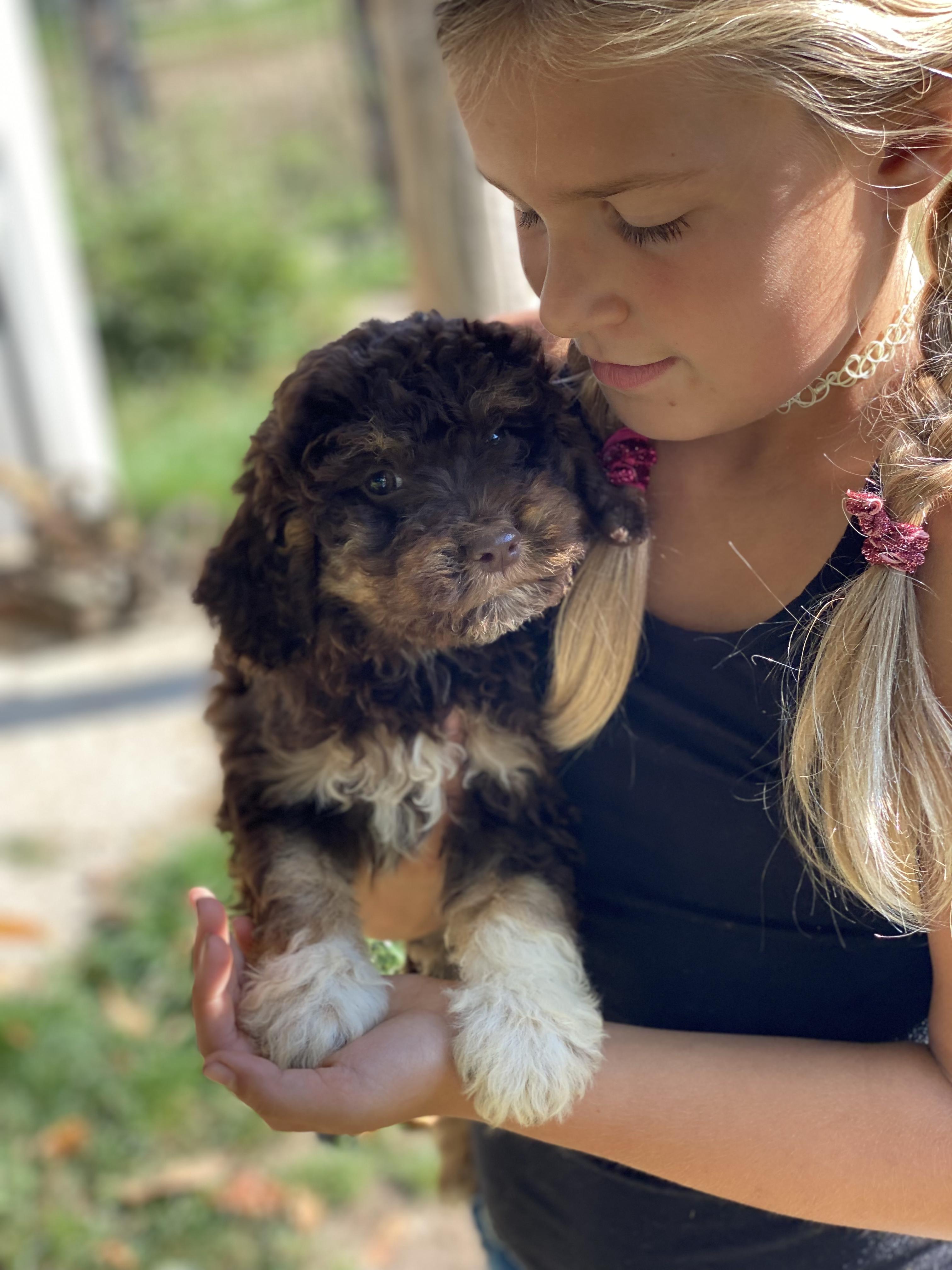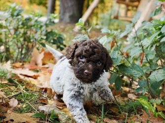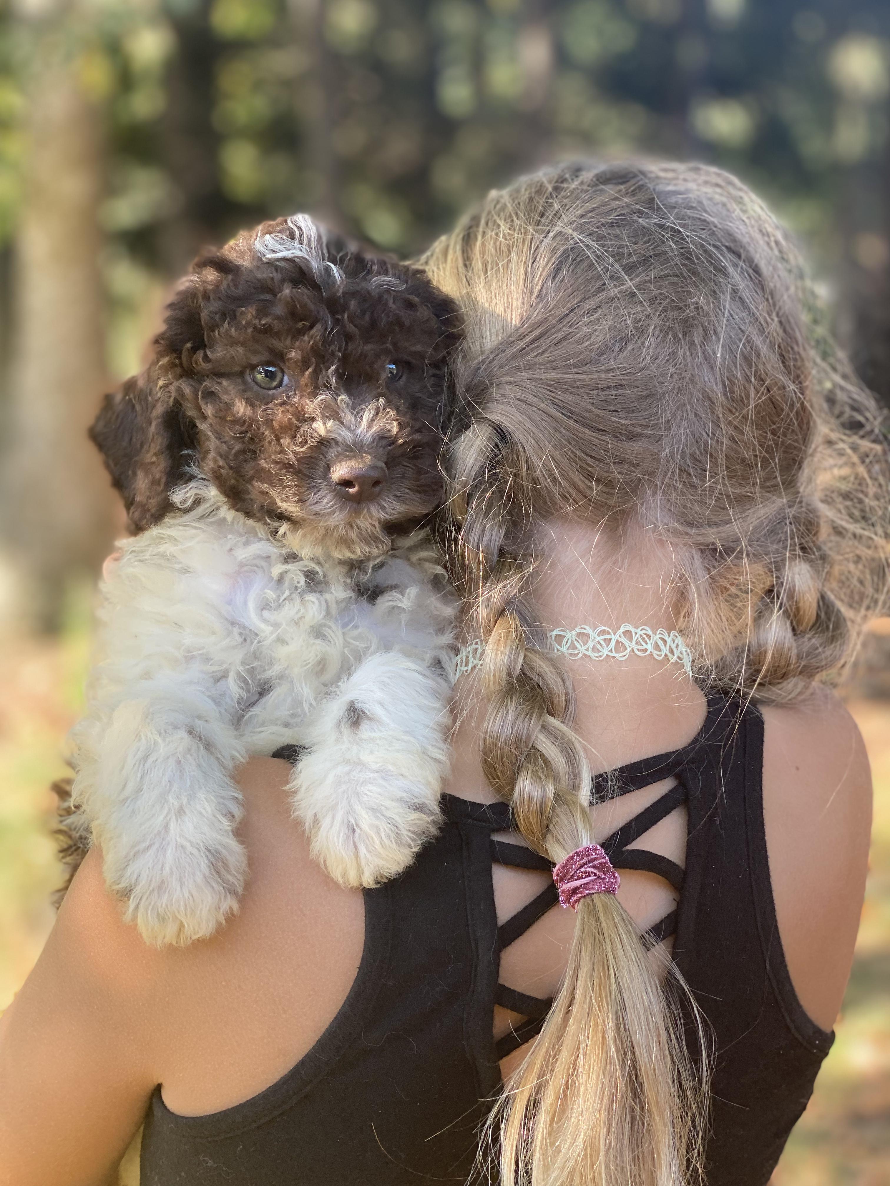 LC is the sweetest dog. she is an international and national champion. she is a 3rd generation Michigan Lagotto. she is beautiful inside and out. she is a roan tri color. fully health tested.