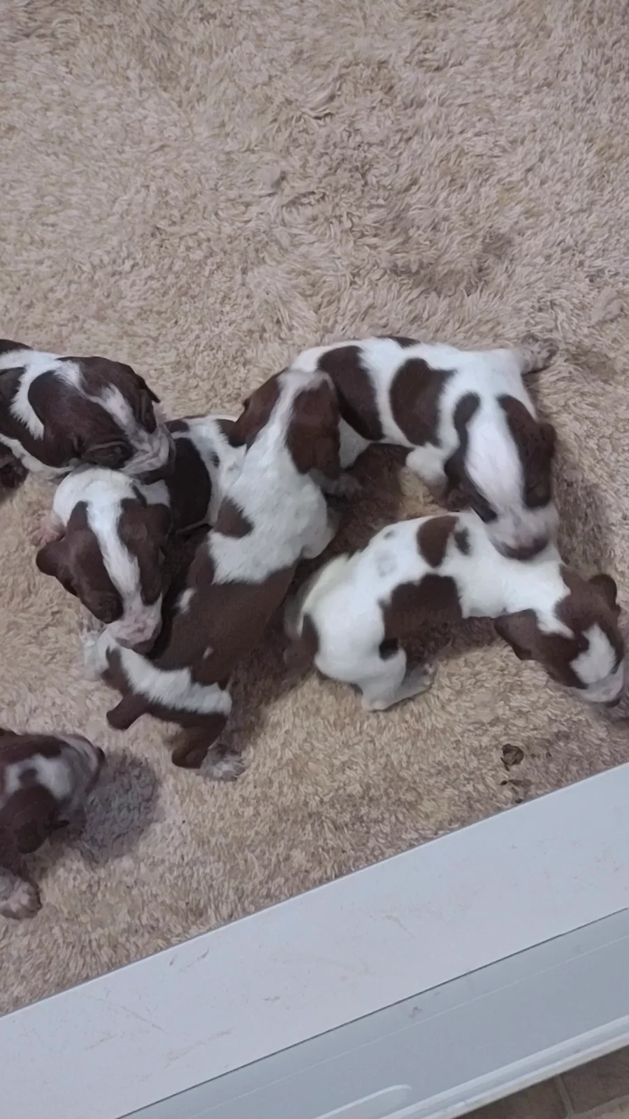 Our puppies include brown roan and white and orange. Colors will vary depending on the parent dogs.
