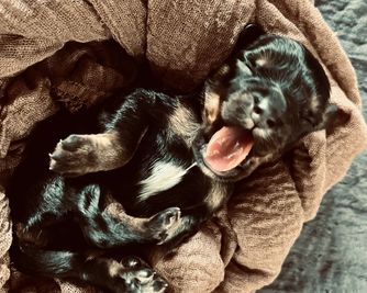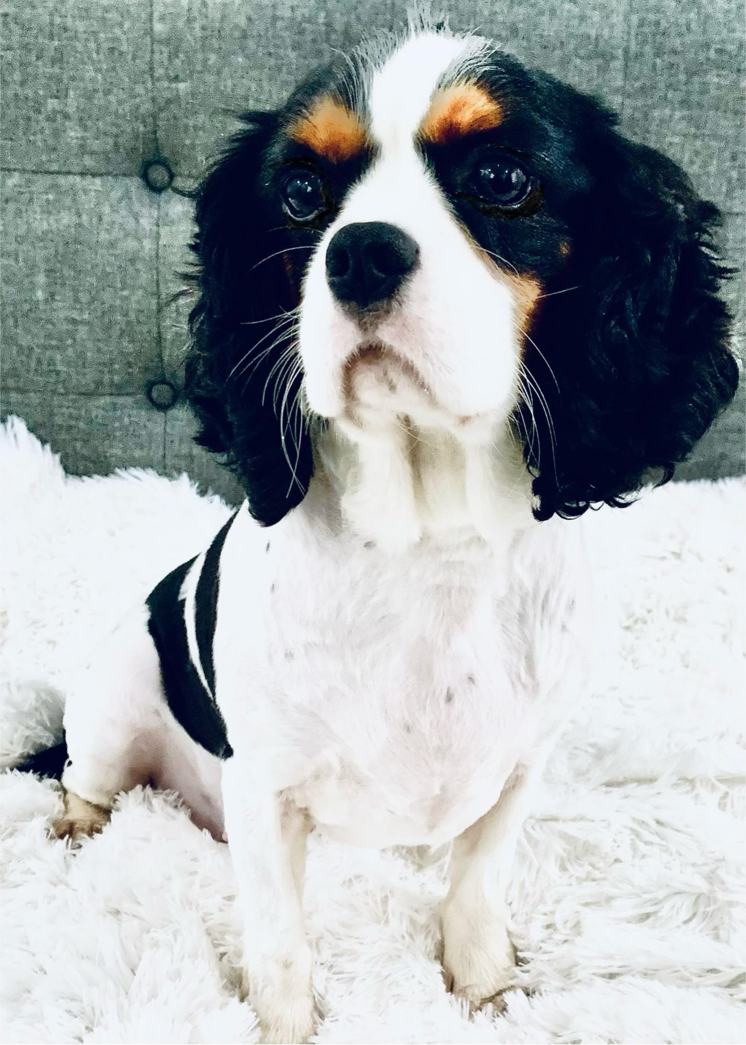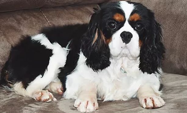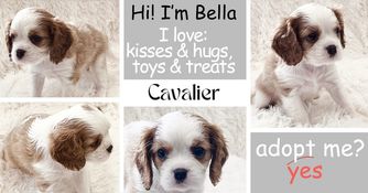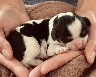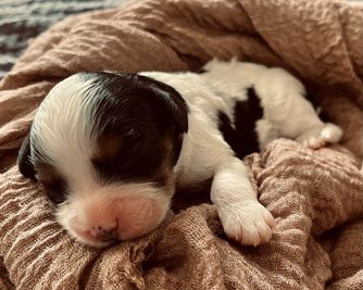 Our Cavalier King Charles Spaniel puppies include blenheim and tri-color. Cavapoo puppies include tri-color, black, and black and white. Colors will vary depending on the parent dogs.